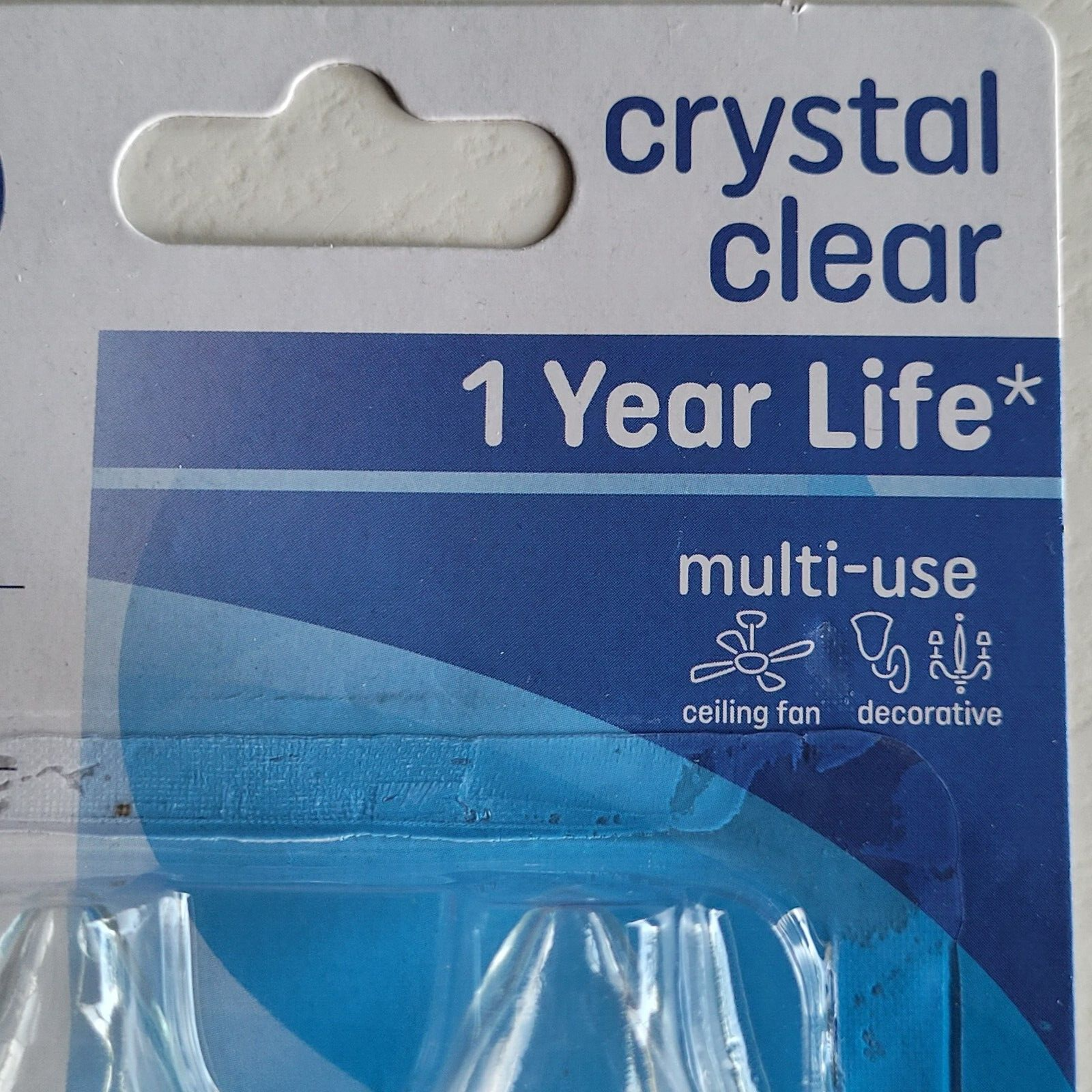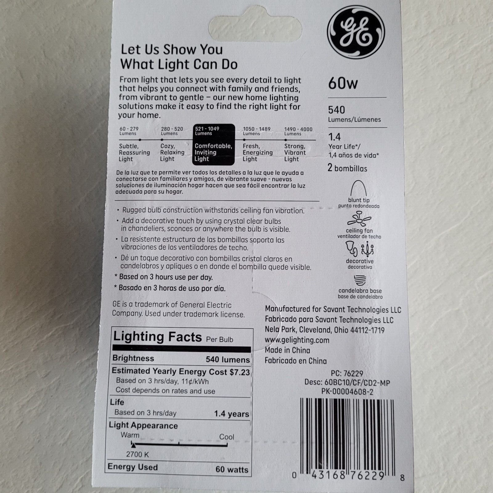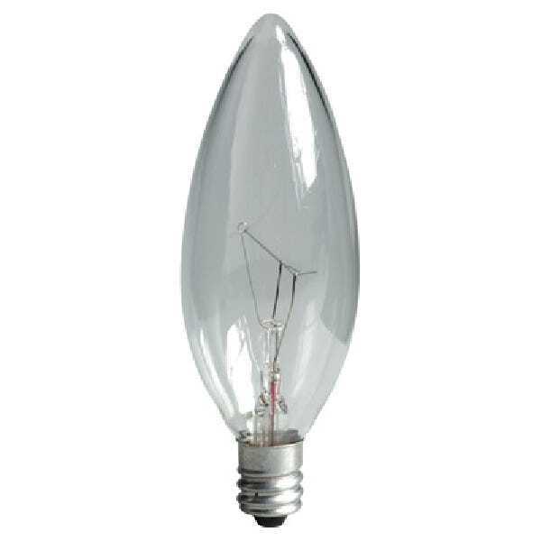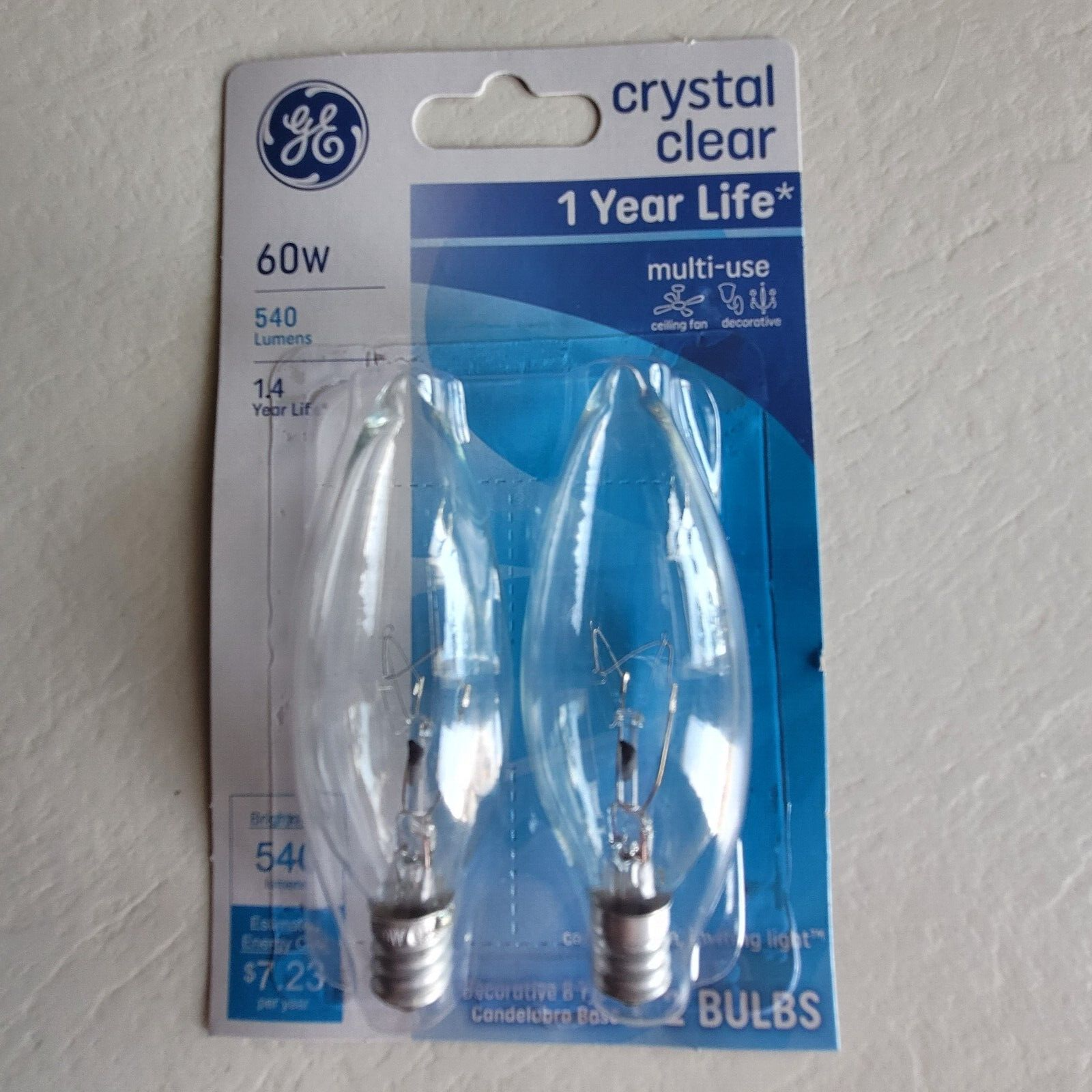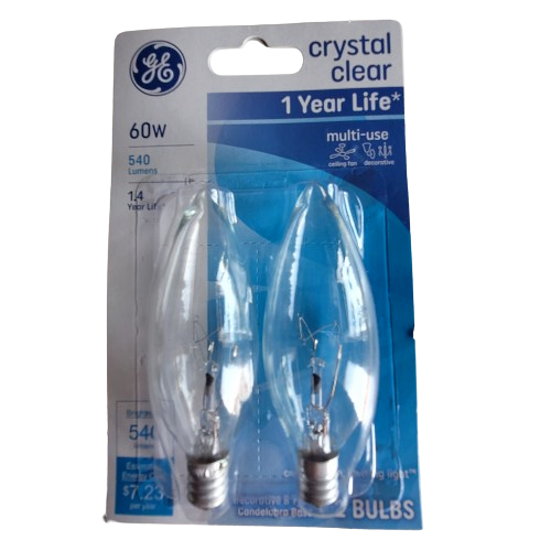 GE Crystal Clear Bulbs add sparkle to your decorative fixtures. The clear glass and elegant filament design provide a decorative touch in fixtures where the bulb is visible. GE crystal clear decorative bulb shape compliments fixtures where the bulb is visible, like sconces and chandeliers. 2 Pack 540 lumens providing cozy, relaxing light Blunt Tip candle with candelabra base for use in chandeliers and sconces Estimated yearly energy costs $7.23 based on 3 hours per day $0.11 per kWh Lasts 1.4 years based on 3 hours per day usage. General Characteristics: Lamp type: Incandescent, Decorative Bulb: B10 Base: Candelabra Screw E12 Primary Application: Ceiling Fan Filament: C-7A Bulb Finish: Crystal Clear Rated Life NOM: 1500 hrs Bulb Material: Soft glass Additional Info: Clear, Blunt Tip, MultiPurpose Deco Photometric Characteristics: Initial Lumens NOM: 540 Color Temperature NOM: 2500 K Nominal Initial Lumens per Watt NOM: 9 Electrical Characteristics: Wattage NOM: 60.0 Voltage NOM: 120.0 Dimensions: Maximum Overall Length MOL NOM: 3.8700 in 98.3 mm Bulb Diameter DIA NOM: 1.2500 in 31.7 mm