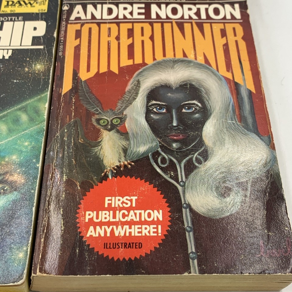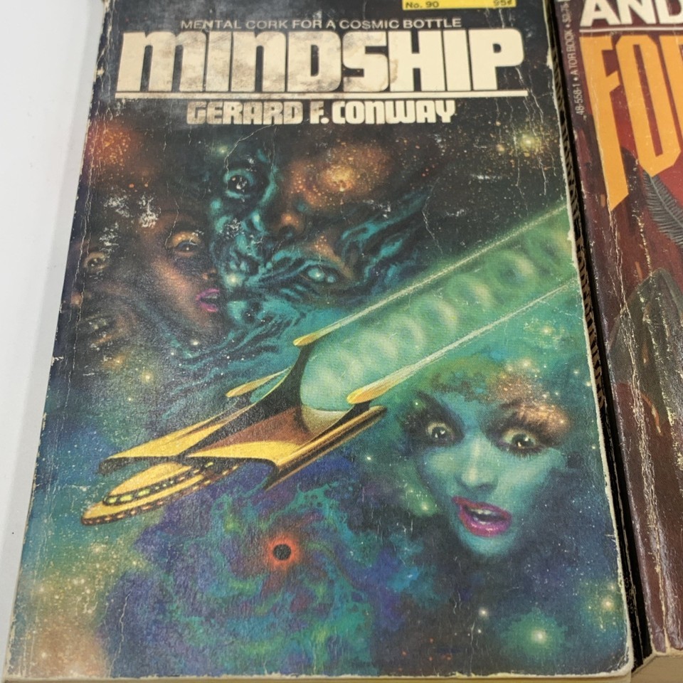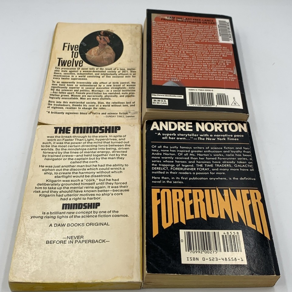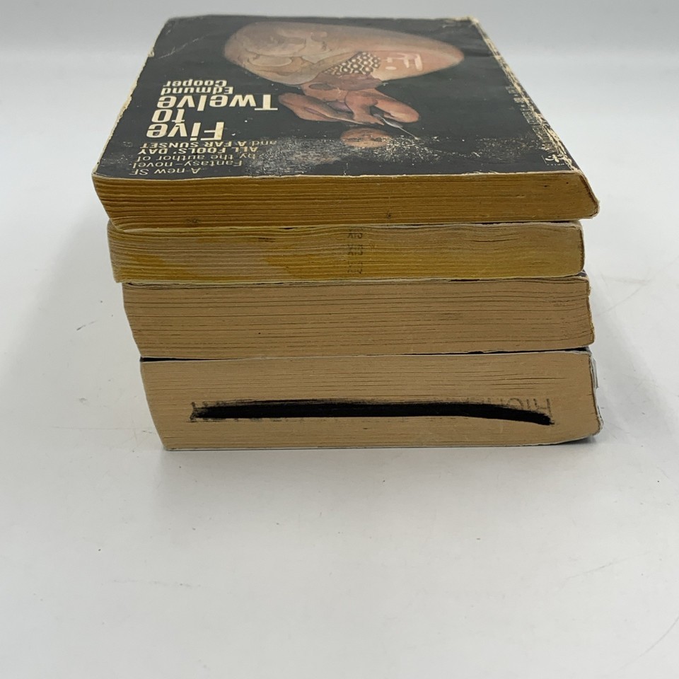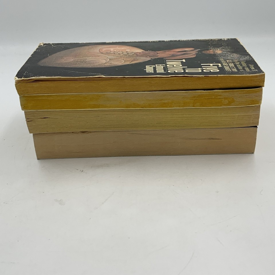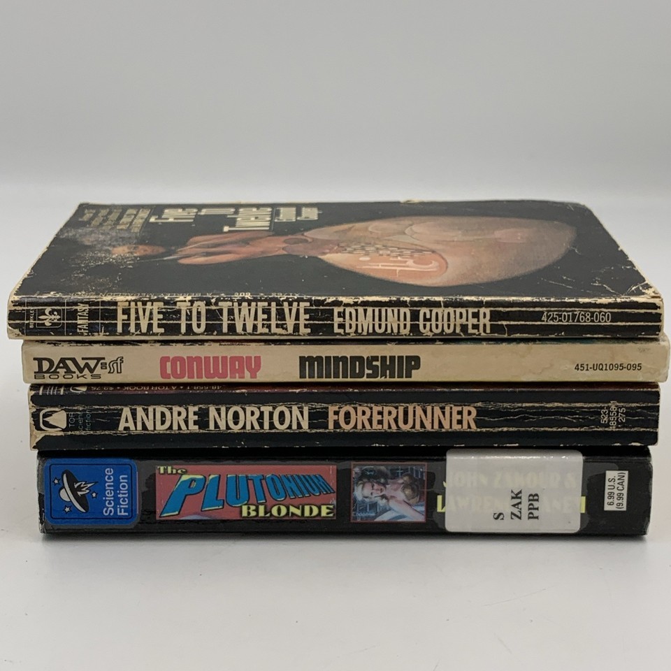 This product is a collection of four mixed science fiction vintage paperbacks featuring sci-fi babes on the covers. The books are bound in softcover wraps, making them the perfect addition for any science fiction enthusiast or vintage paperback collector. Each title likely offers a unique and exciting adventure in the world of science fiction, providing readers with a mix of diverse and captivating storylines. Perfect for those who enjoy diving into the imaginative and futuristic worlds created by these classic novels.