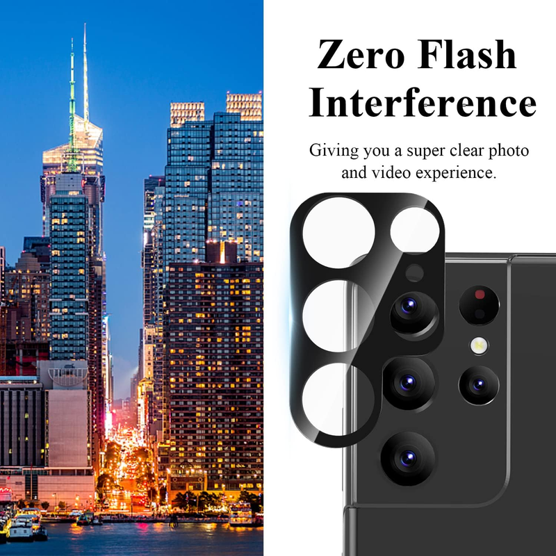 ?Non-Interference Flash?The camera lens protector is designed for Galaxy S22 Ultra which consists of acrylic and glass, using augmented reality "seamless" fusion new technology, with enhanced light transmission function, it can be 99.99 % Guarantee the original quality of photos and videos, giving you a super clear photo and video experience.