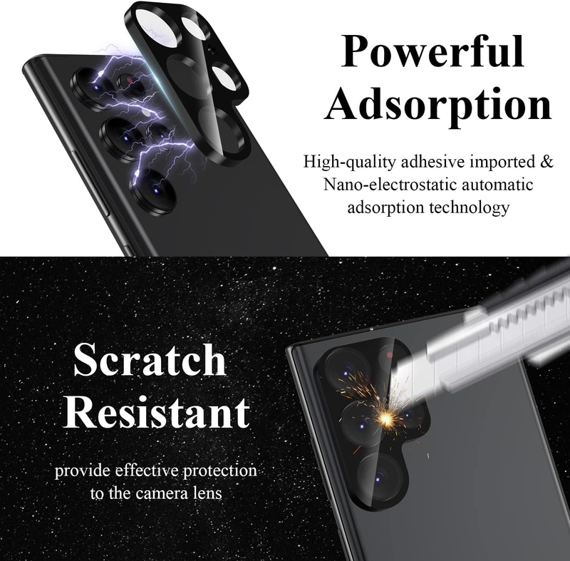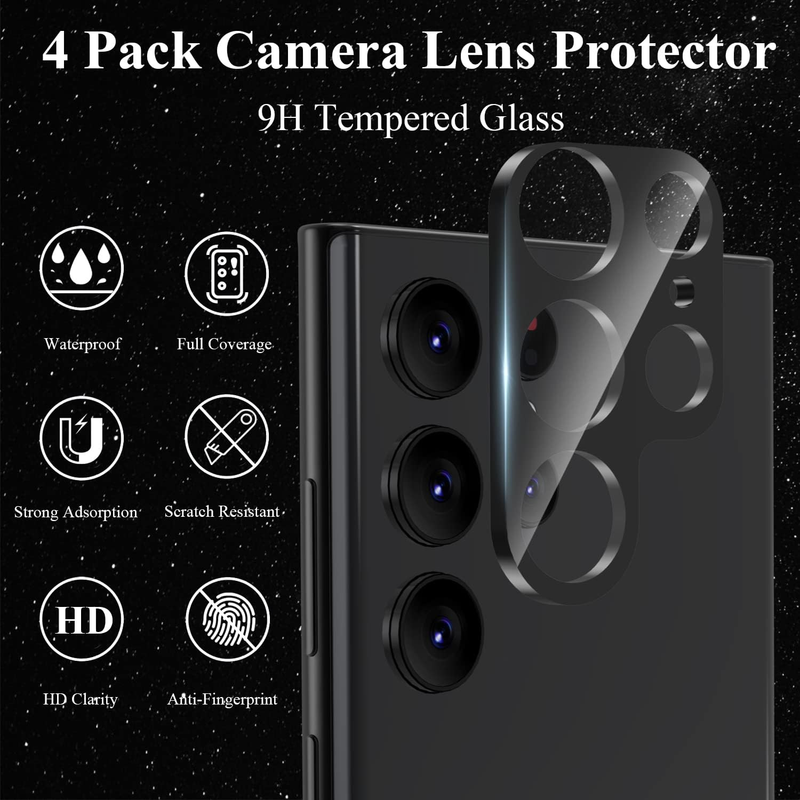?Full Coverage Protection?Precise laser cutting size provides maximum protection and double secure for the entire camera lens of your Samsung Galaxy S22 Ultra, 9H Glass camera protector effectively protects the entire camera lens from drops, scratches and abrasions. The oleophobic layer prevents dust and fingerprints, which can keep your phone lens clear and clean all day long.
