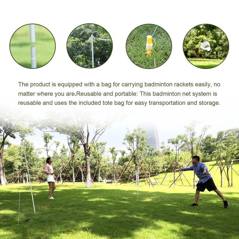 Reusable and portable: This badminton net system is reusable and uses the included tote bag for easy transportation and storage. Rackets have a fine balance of weight power, so the racket can easy to break out the power and make the offensive can't be stopped. Reusable and portable: This badminton net system is reusable and uses the included tote bag for easy transportation and storage. Rackets have a fine balance of weight power, so the racket can easy to break out the power and make the offensive can't be stopped. Lighters but stronger. Lighters but stronger. The product is equipped with a bag for carrying badminton rackets easily, no matter where you are The product is equipped with a bag for carrying badminton rackets easily, no matter where you are