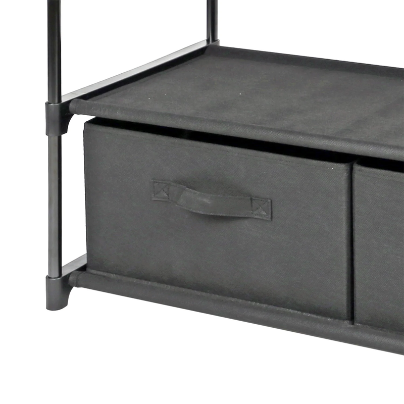 Multi-purpose closet organizer ideal for most shoes, clothes and accessories; Includes 2 collapsible and removable fabric bins; Durable steel frame construction; Durable plastic bars for easy assembling; Suitable for adult and kids; Assembled dimensions: 31.25 in W x 13.5 in D x 31.5 in H (79.4cm x 34.3cm x 80cm)