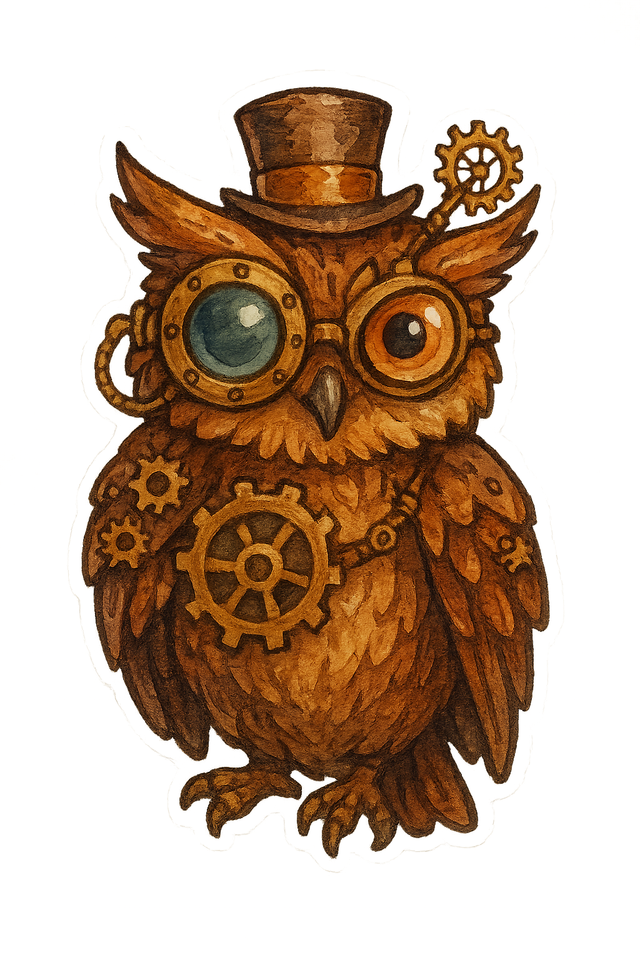 This detailed sticker features a wise old owl decked out in classic Steampunk fashion, including a brass-riveted top hat and elaborate clockwork goggles with a magnifying lens. Adorned with gears and cogs, this magnificent mechanical bird is a must-have for any Steampunk enthusiast, lover of owls, or collector of unique decals.
