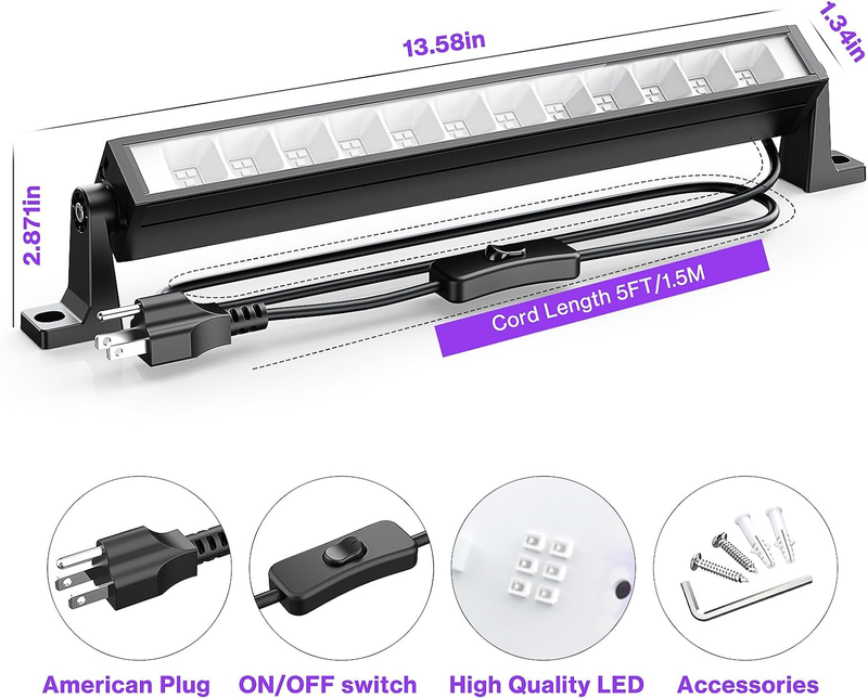 40W High Brightness : Each black light bar has 68 upgraded high-quality beads which can illuminate 484 Sq.ft Area and the beam angle reaches 120 degrees, which meets the needs of activities, birthday parties, Halloween lights and other occasions that require large areas of black light