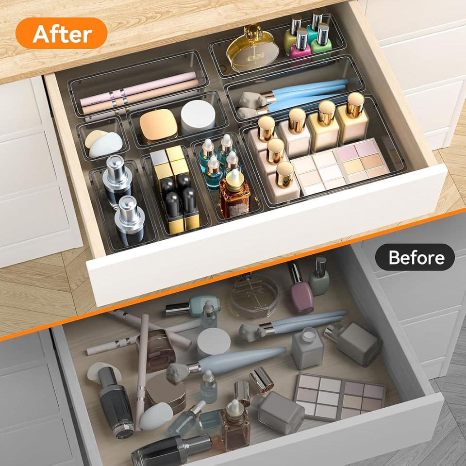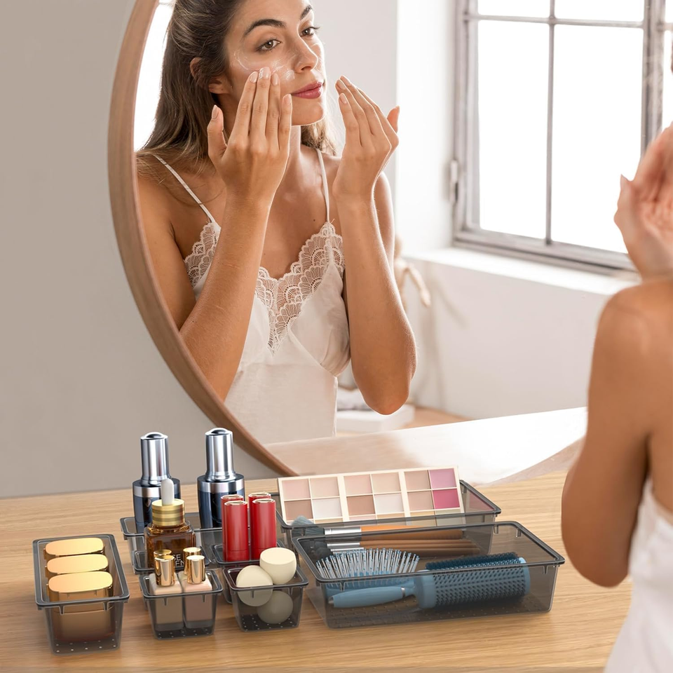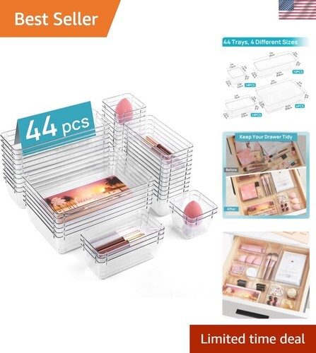 - 44 PCS Clear Drawer Organizer Set with 4 Sizes Storage Bins for Makeup Jewelry