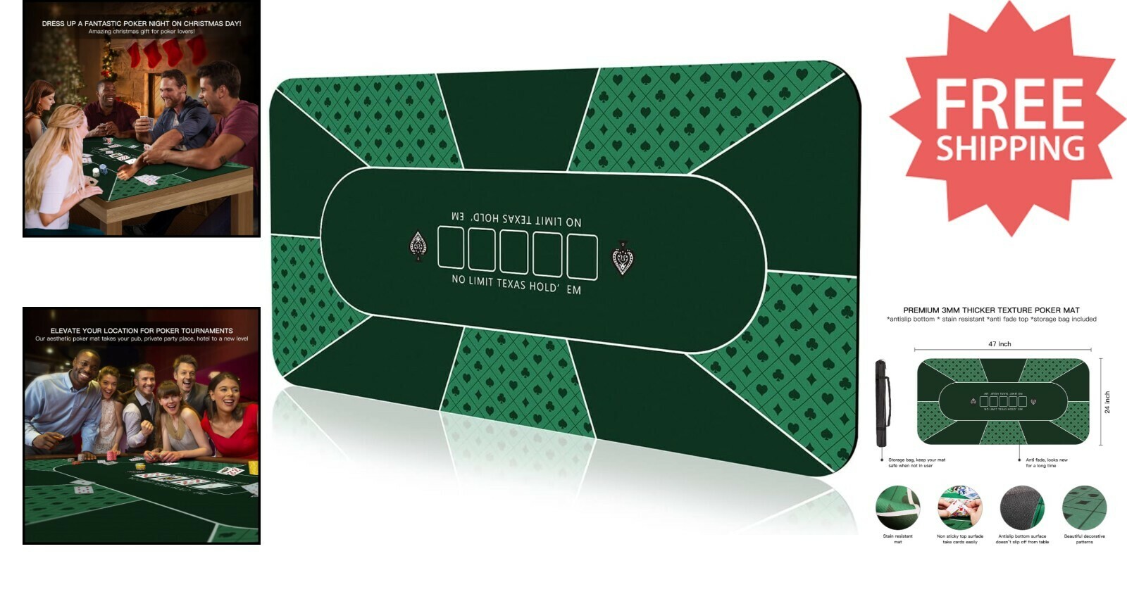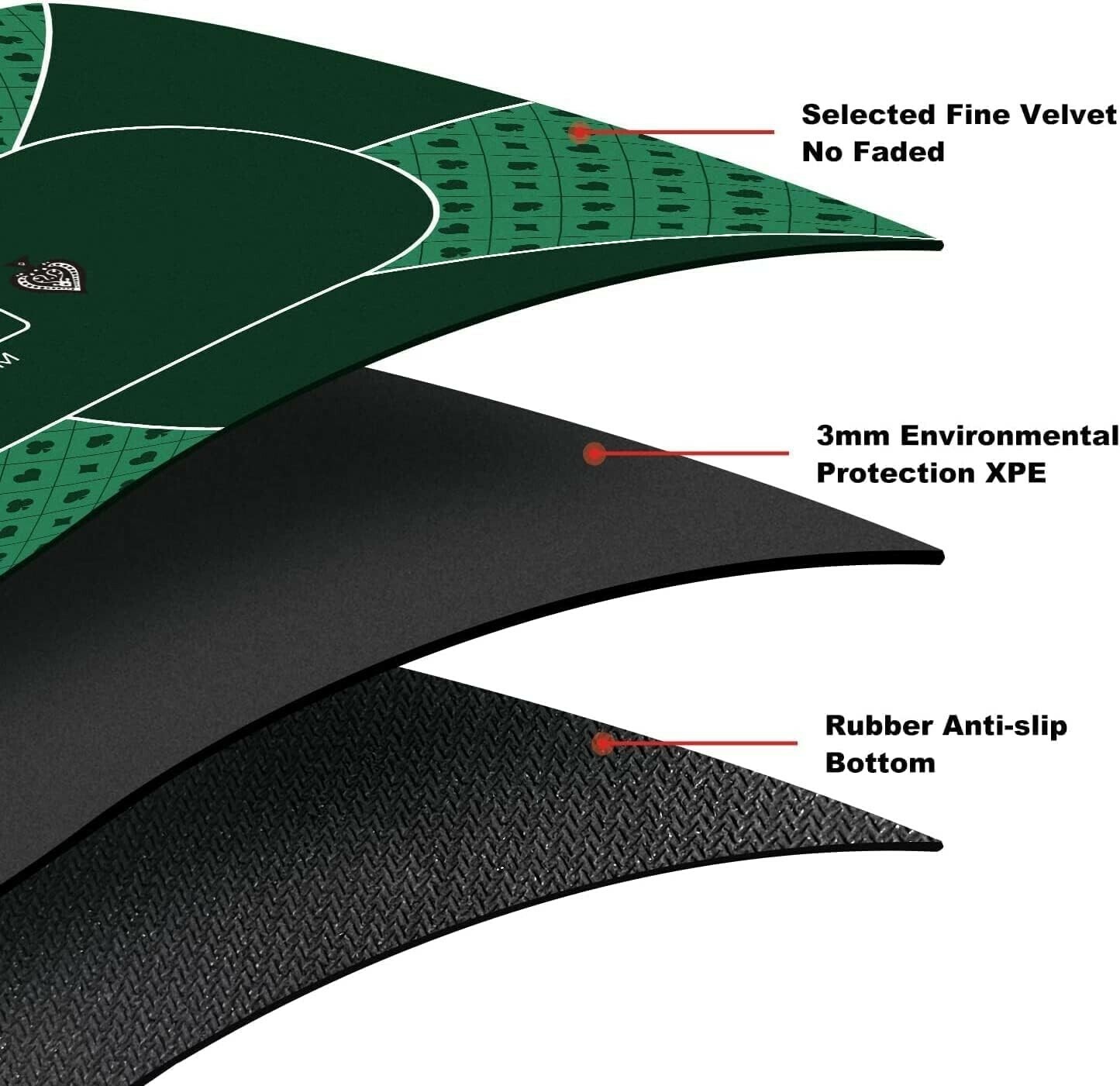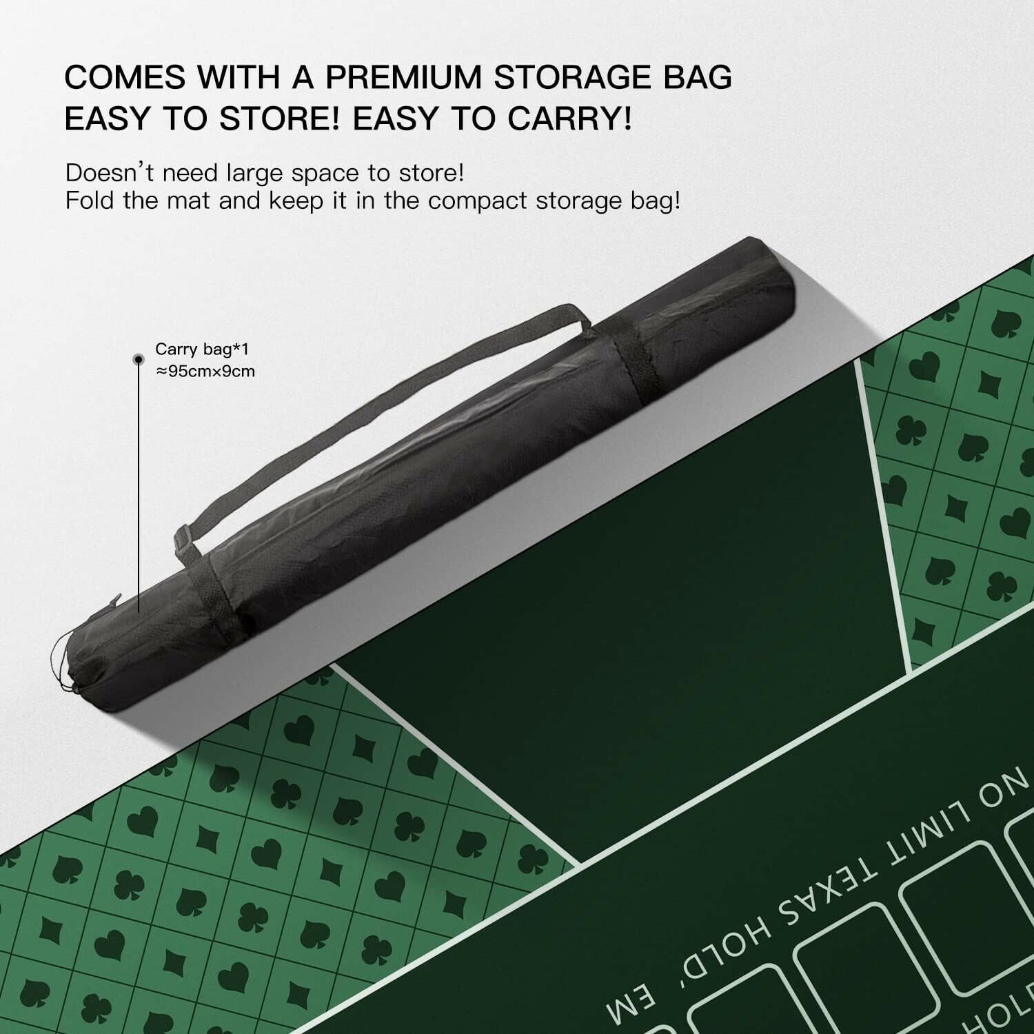 Experience a superior gaming surface with our 3mm thick poker mat, measuring 47x23 inches. Crafted with high elasticity rubber and multi-spandex materials, it offers remarkable durability and stability, lying flat without wrinkles. Designed for portability, it comes with a sleek black handbag for easy transport and storage, making it perfect for on-the-go poker games. The ultra-smooth, fuzzy-free surface provides a seamless playing experience, while the non-slip rubber base with a herringbone texture ensures your mat stays firmly in place during intense moments. Measuring 47x24 inches, it comfortably accommodates 4-6 players and transforms any table into a professional poker setup. Elevate your game with this elegant, functional poker mat that combines practicality with style.