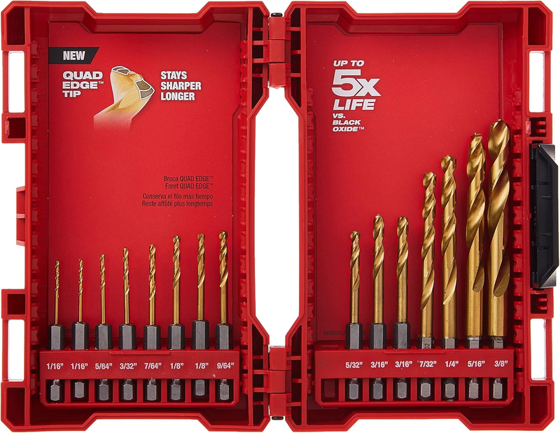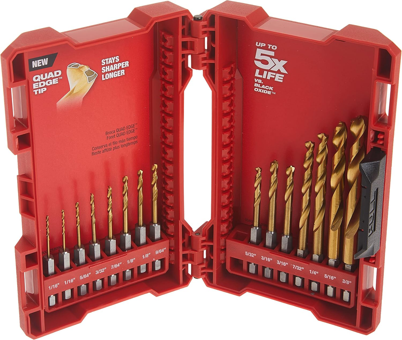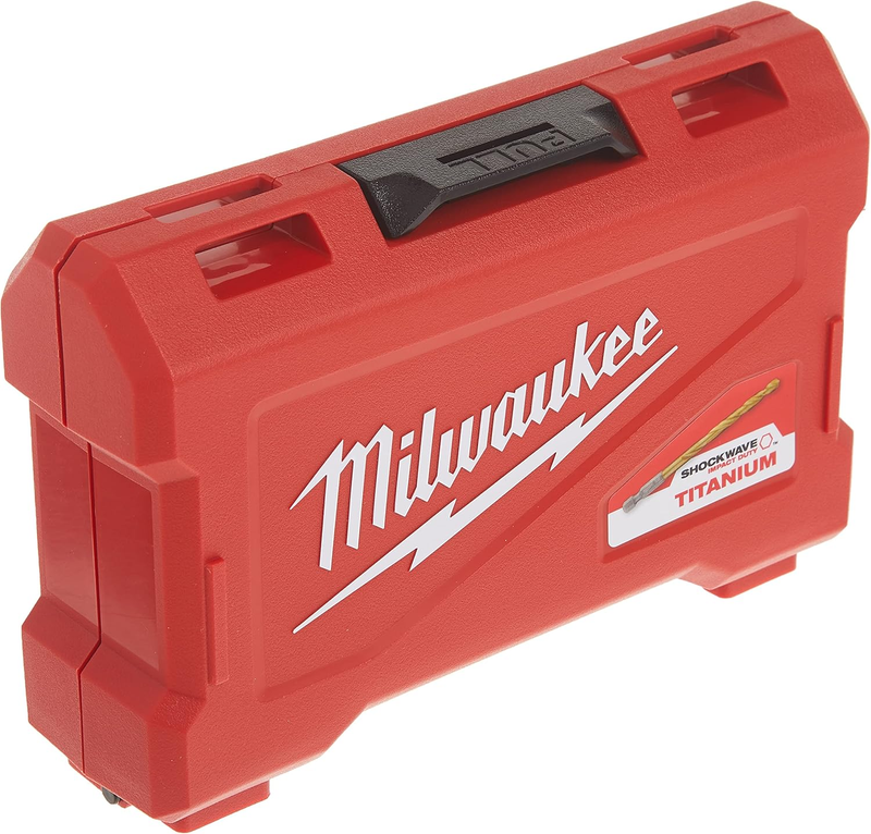 Shockwave, 15 Piece, Impact Duty Titanium Drill Bit Set, Engineered To Stay Sharper Longer, New Red Helix Bits Feature A Variable Helix Flute Geometry For Faster Material Removal, Chip Breaker To Decrease Heat Build Up 135 Degree Split Point To Prevent Walking.