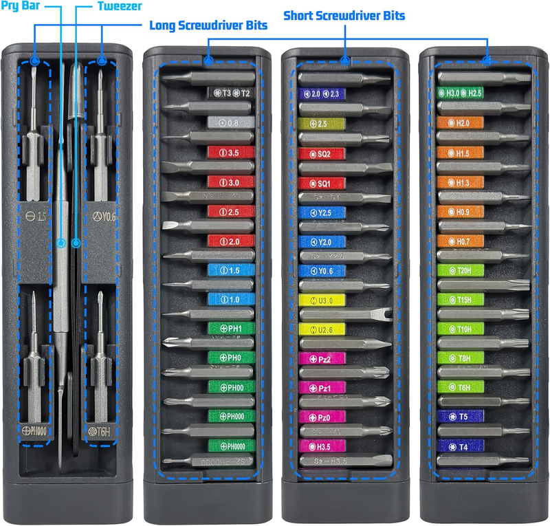 Includes spare bits for high-use types like Phillips, Slot, and Tri-Point.