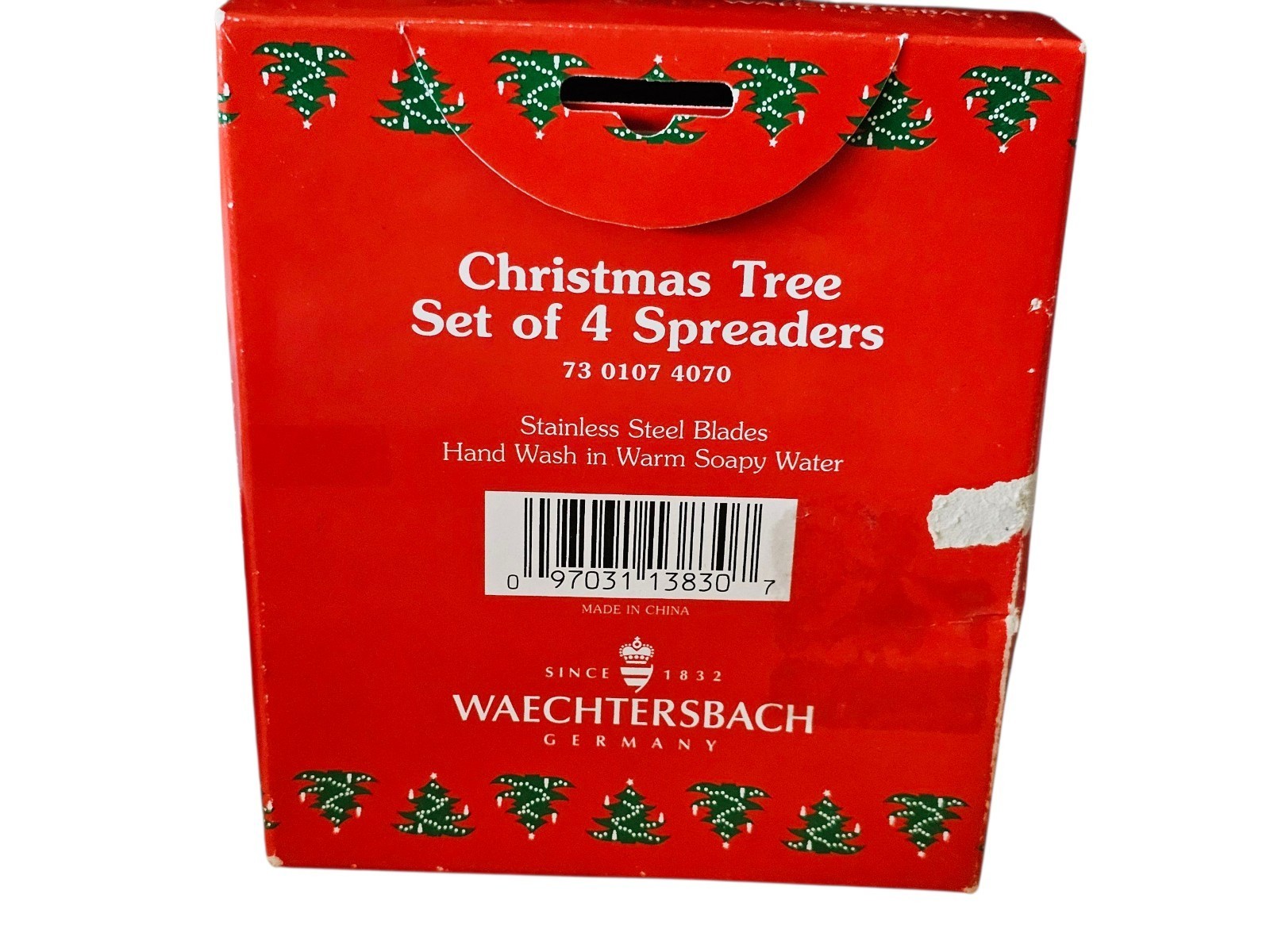 The product is a set of 4 Waechtersbach Christmas Tree spreaders or mini knives, perfect for adding a festive touch to your holiday table decor. These multi-color spreaders feature a Christmas Tree design, making them a charming addition to your dining experience during the holiday season. Made of metal and plastic, these spreaders are durable and easy to use, making them a practical and decorative choice for teens and adults alike. Imported from China, these Tree Spreaders are a unique and fun way to celebrate Christmas.