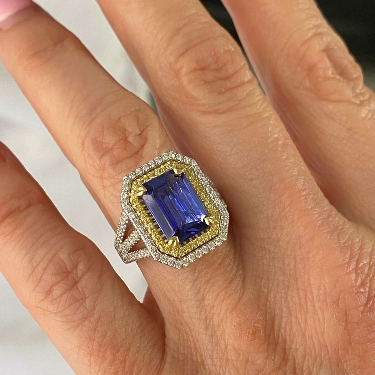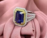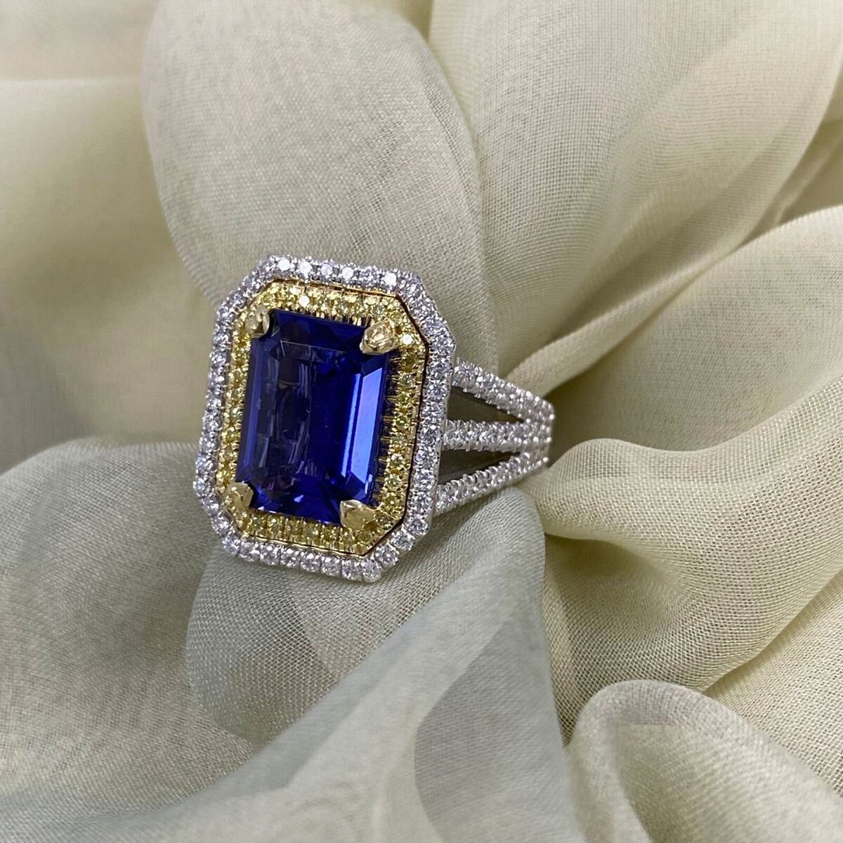 Dieser stilvolle Ring verfügt über einen 4,18 -Karat -GIA -zertifizierten Violet Emerald Cut Tansanit, der von einem doppelten Halo von farblosen und gelben runden brillanten Diamanten in der Mikro -Pave -Umgebung umgeben ist. Zusatzliche Diamonds lautet den dreifachen Split Shank und unter der Galerie und vervollstandigt die schimmernde Eleganz dieses Rings !!! Der Ring wird mit einem Gewicht von 14 Karat zwei Tonen gefertigt, das mit einem hohen polnischen Finish leuchtet. Das Gesamtkaratgewicht betragt 5,10 Karat.