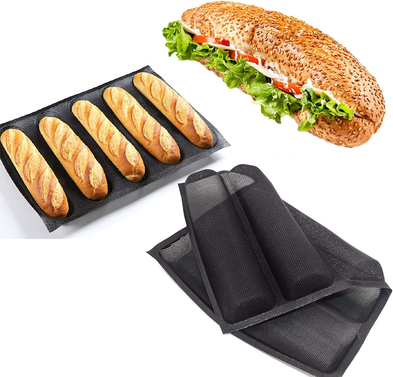 HEATING EVENLY: These loaf pans for baking bread, are soft flexible liners, easily foldable for storage; The mesh design makes air better circulates, and heat more evenly distributed. So the water vapor can easily flow through, making your bread turn out with a golden crispy crust; Such baguette pan is nice for baking hot dog buns, sub buns, French bread, baguette and sandwiches; Able to withstand up to 500?/260?, this baking liner works great in ovens or microwave, BUT NOT ON OPEN FLAME;