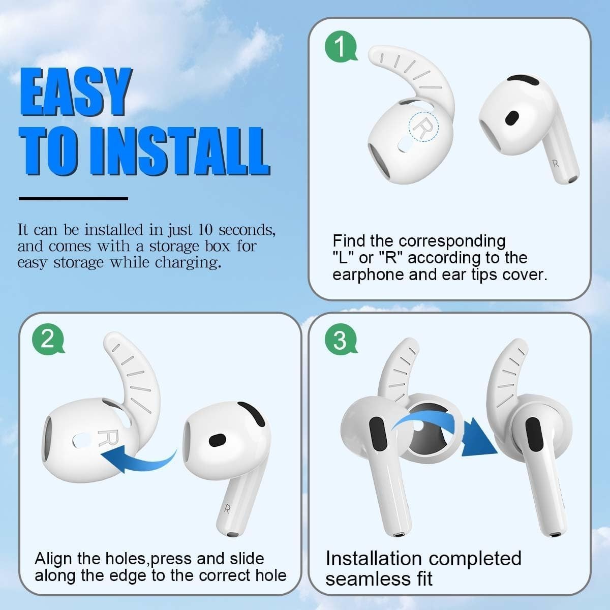 5 Pairs air pods 4 eartips cover (Black/White/Red/Pink/Blue), with a storage box, so that you can store your eartips cover after removing or replacing the eartips cover (The airpods and earpods NOT included)