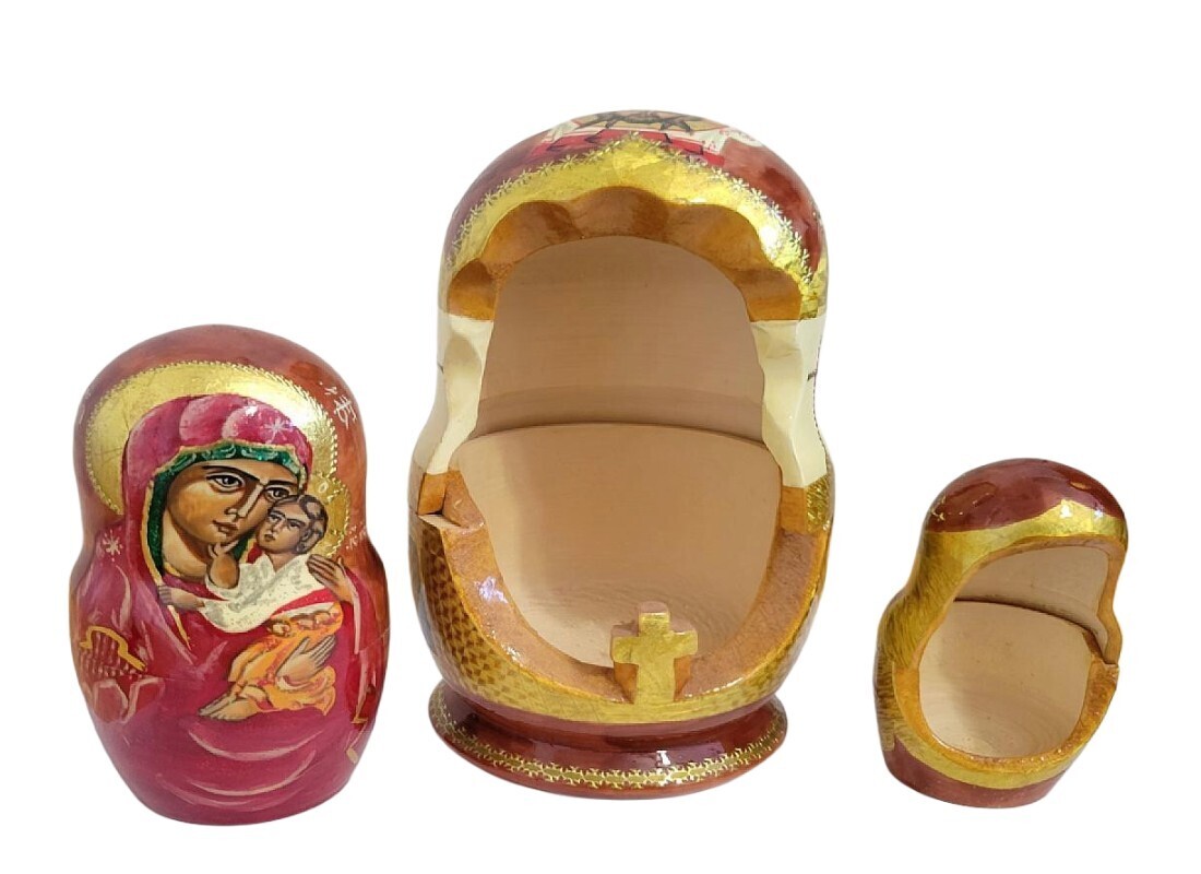 Este producto consta de 5 muñecas de anidacion rusas pintadas a mano que representan la madonna y el niño, de pie a una altura de 7 pulgadas. Cada muñeca esta intrincadamente elaborada con importancia religiosa, lo que refleja las tradiciones y creencias del cristianismo. Hecho en la Federacion de Rusia, estas muñecas hechas a mano son un elemento único y coleccionable que muestra el rico patrimonio cultural y el simbolismo religioso de la region. La muñeca presenta cortes tallados a mano e hermosos iconos pintados a mano como Cristo, el maestro. Firmado por el artista en la parte inferior de la primera muñeca.