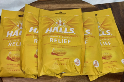 ? FIVE packages of 30 HALLS Relief Honey Lemon Cough Drops (packaging may vary) Expiration 6/2026 ? Relieves coughs, soothes sore throats and cools nasal passages ? Contains 7.5 mg of menthol per drop to relieve symptoms ? Pleasant honey lemon flavor is refreshing and soothing ? Individually wrapped drops in a resealable bag make it easy to take with you; use as directed ? Packaging may vary. Please refer to the actual packaging for current information for this product