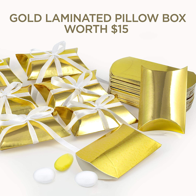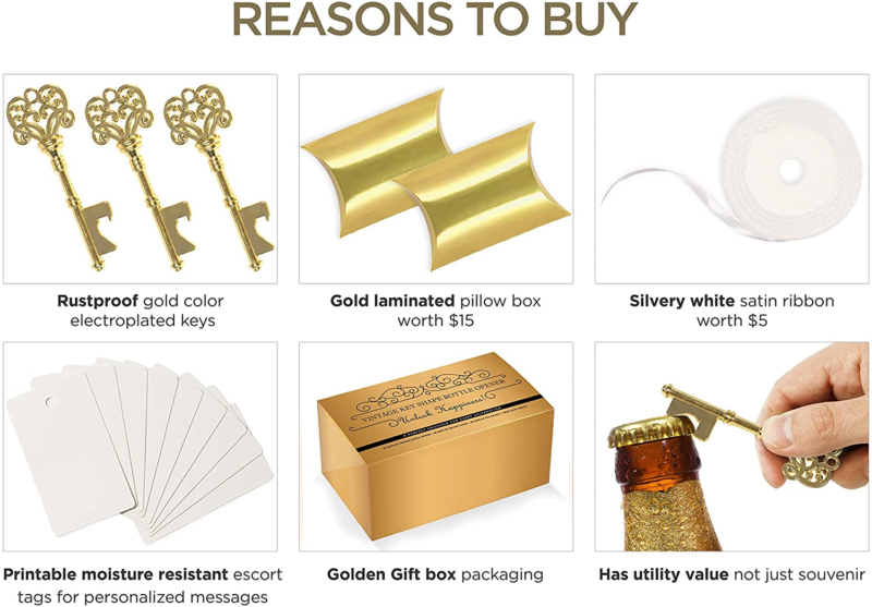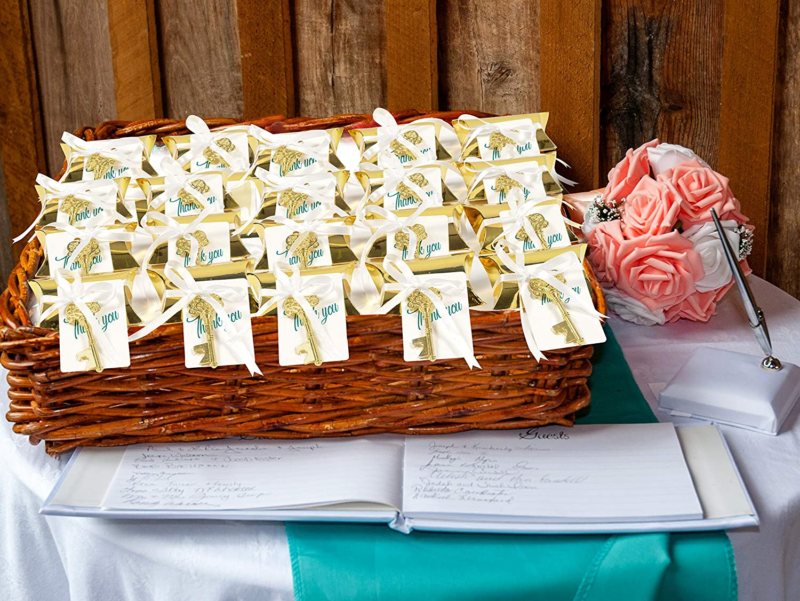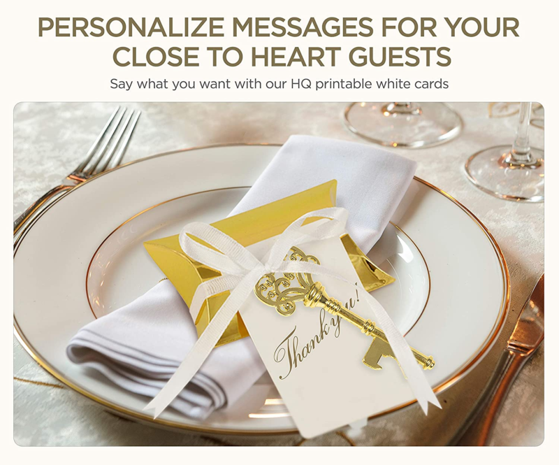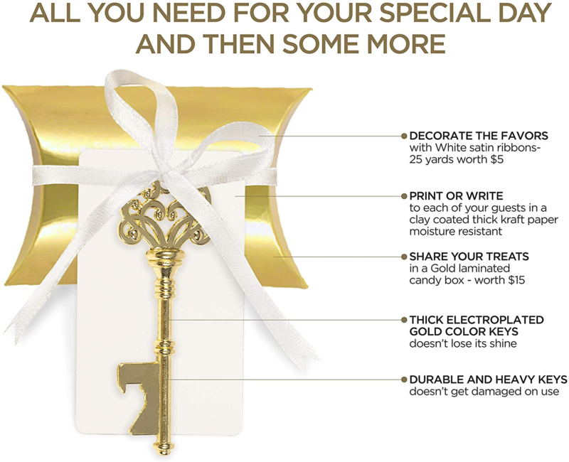 EXQUISITE SOUVENIR FOR YOUR GUESTS - Wedding- favors and wedding decorations: The lustrous gold tones on the key, the matching golden pillow candy box, classy white escort tags with white satin ribbon will accentuate your wedding décor with a GOLD VINTAGE or ROYAL TOUCH. Hang these off a tree for your guests to collect, or spread them out on a tabletop in STUNNING EYE CATCHING arrangements