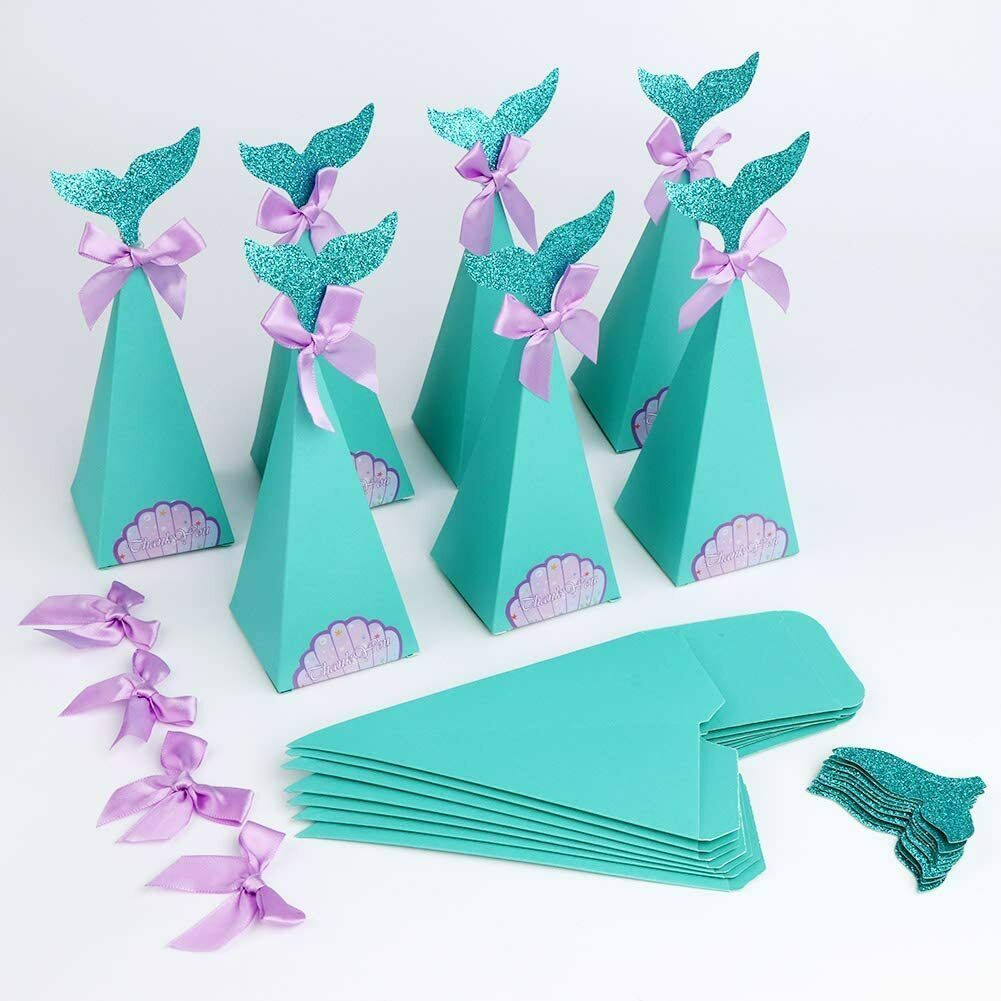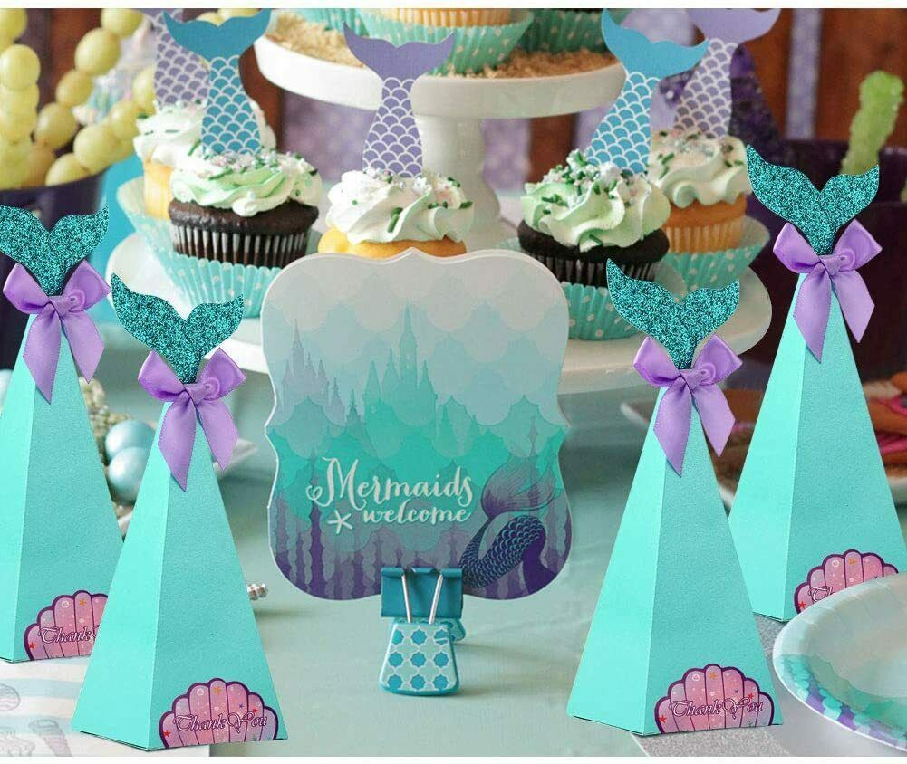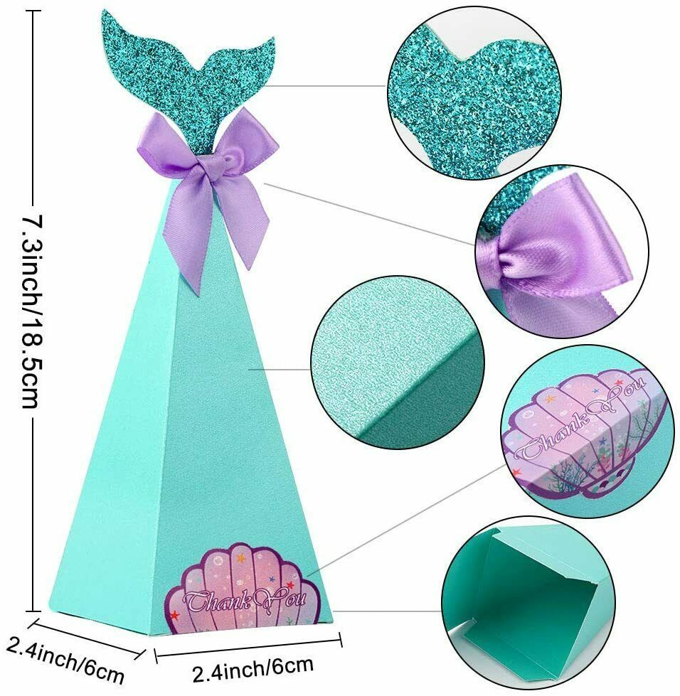 ?PACKAGE INCLUDED - 50 Mermaid Favor Boxes, 50 Glitter Tails, 50 Purple Bows, 50 Thank You Shell Stickers, 50 Glue Dots, enough for kids mermaid themed party decorations