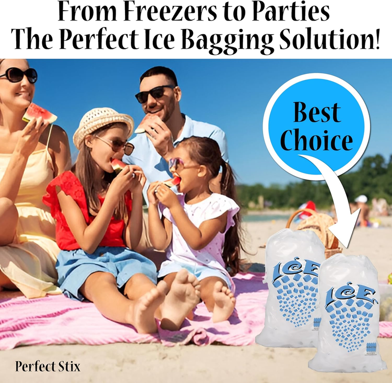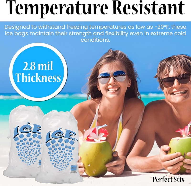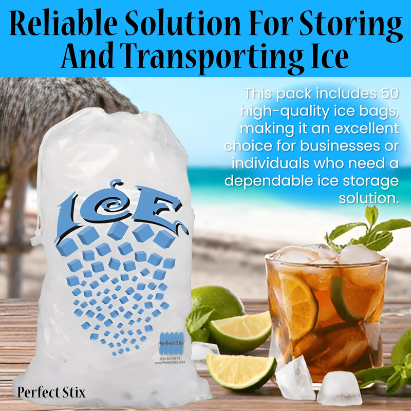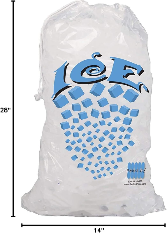 Perfect Stix 50 PACK 20 lb. Drawstring Ice Bags 14 x 28 Inch Plastic Ice Bags. Heavy Duty with Draw String (2.8mil Thickness). Pack of 50CT
