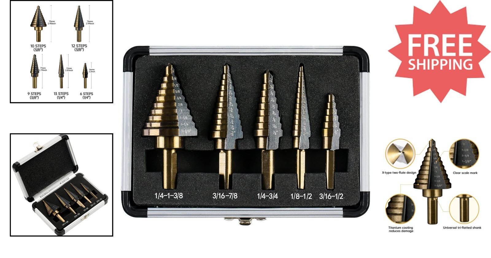 50 Size HSS Titanium Step Drill Bits ? 5PC Set in Aluminum Case for Versatility