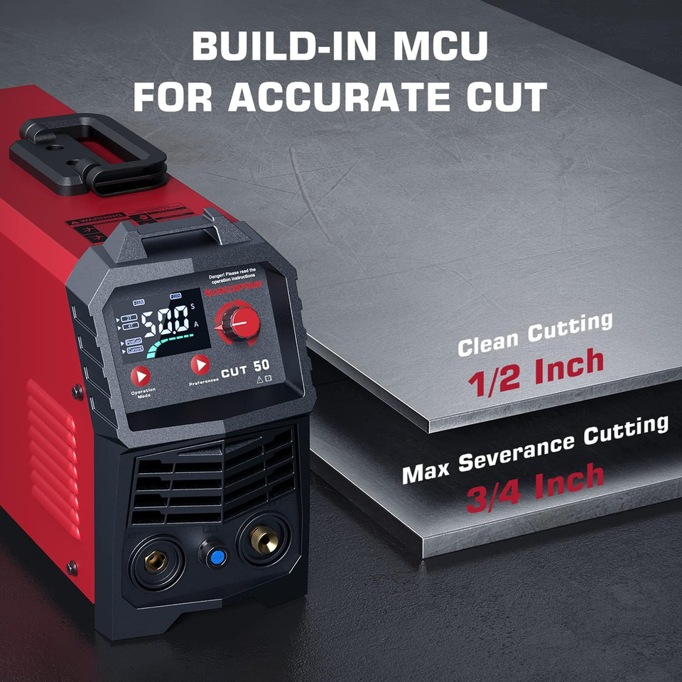 ?POWERFUL CUTTING?Automatic dual-voltage 110/220V. This plasma cutter features high-frequency arc starting mode, efficiently cuts through rough, painted, and rusty surfaces and produces minimal slag. With advanced IGBT inverter technology, the maximum severance cut can reach up to 3/4" (20 mm), 1/2" (10mm) ideal clean cut, 60% duty cycle. Suitable for alloy steel, stainless steel, mild steel, copper, aluminum, etc.