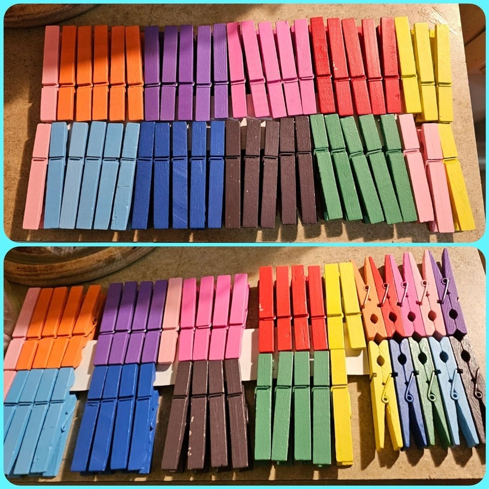 ?10 COLORS CLOTHES PINS?- Clothespins are 10 colors and each 5pcs, total 50PCS.Size 2.9* 0.4* 0.6 inch, and with comfortable design bright color. Lightweight, cute and multi-useful clips for pictures light up your life and bring you a good mood. Colour wood clothespins are great for the kids to use their imagination and develop intelligence,an awesome thing for their minds to build