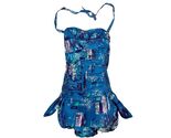 Vintage Rose-Leen Ladies Swimsuit XS from Canadian Beach Wear in a turquoise blue abstract print in pink and green. "Bubble Butt" is the term for this style, for obvious, ahem, reasons! It is for a teeny woman with a teeny bust. It may be best for display or teen girls.