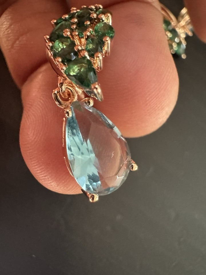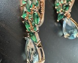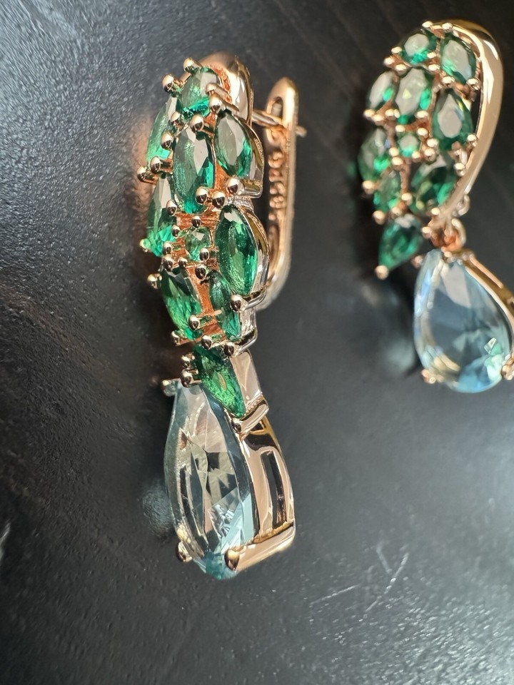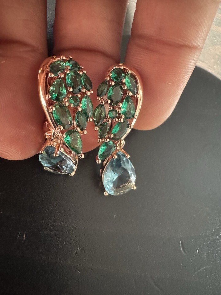 585 14K RG Rose Gold Stamped Radiant Green Blue Feathers Dangle Stud Earrings
