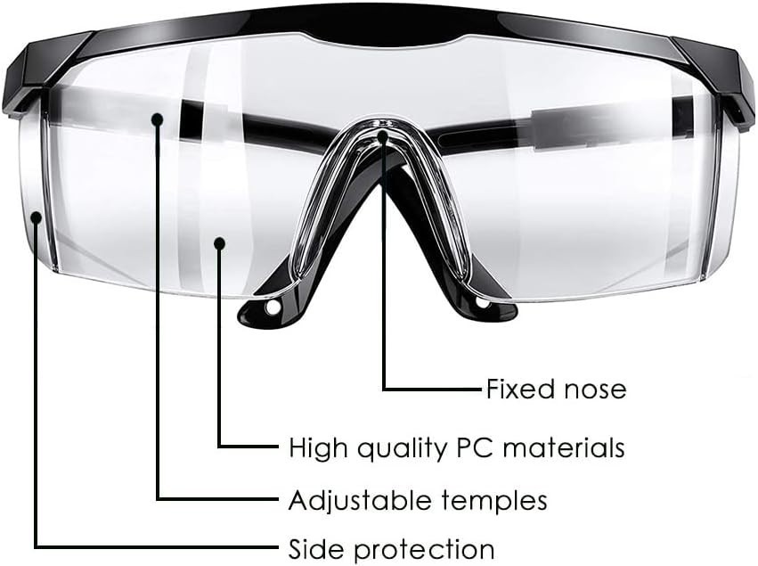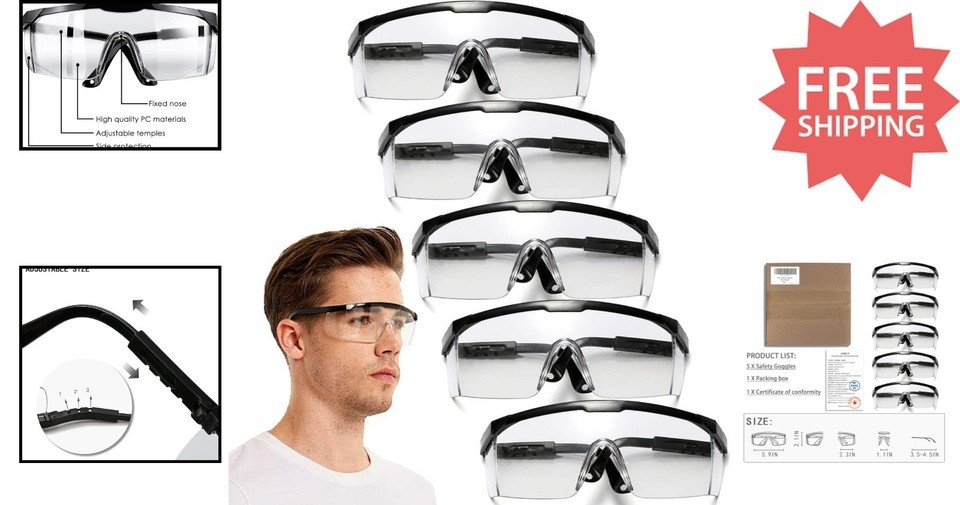 Enhance your safety with this set of 5 fashion safety goggles, designed to provide comprehensive protection against water, wind, dust, and shocks. Featuring adjustable temples and a lightweight design, these goggles ensure a comfortable fit for extended wear. The fog-proof, transparent lenses deliver crystal-clear vision, suitable for various environments such as home, classroom, construction sites, laboratories, and outdoor activities. Crafted with high comfort and multi-layer protection?including UV, anti-scratch, anti-fog, and impact-resistant features?these goggles are perfect for professionals and everyday use alike. Elevate your safety gear with trusted quality and ergonomic design.