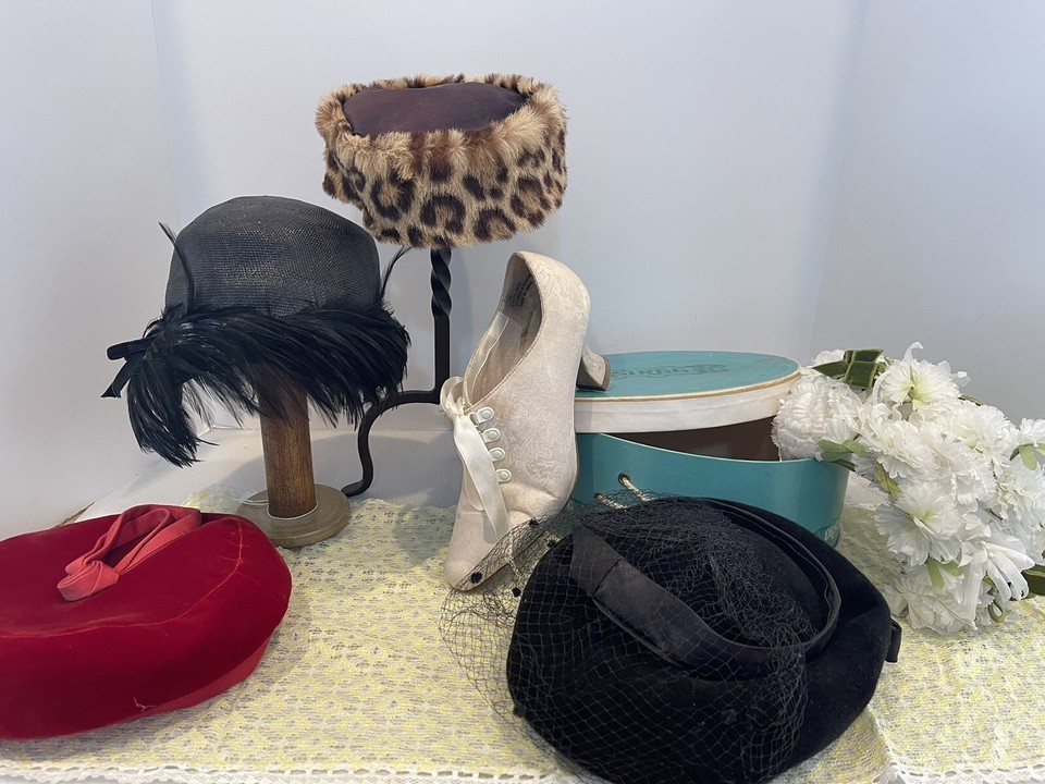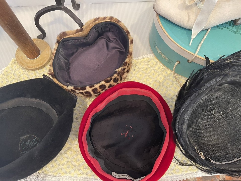 - 5pc Hat collects with Hatbox and Stand Gertrude Menczer, L.Bamberger