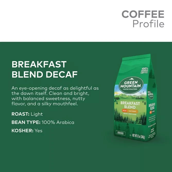 - 6 Bags Of Green Mountain Breakfast Blend Decaf Ground Coffee 12oz Best by 8/2O25