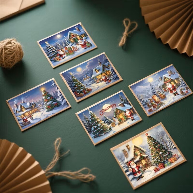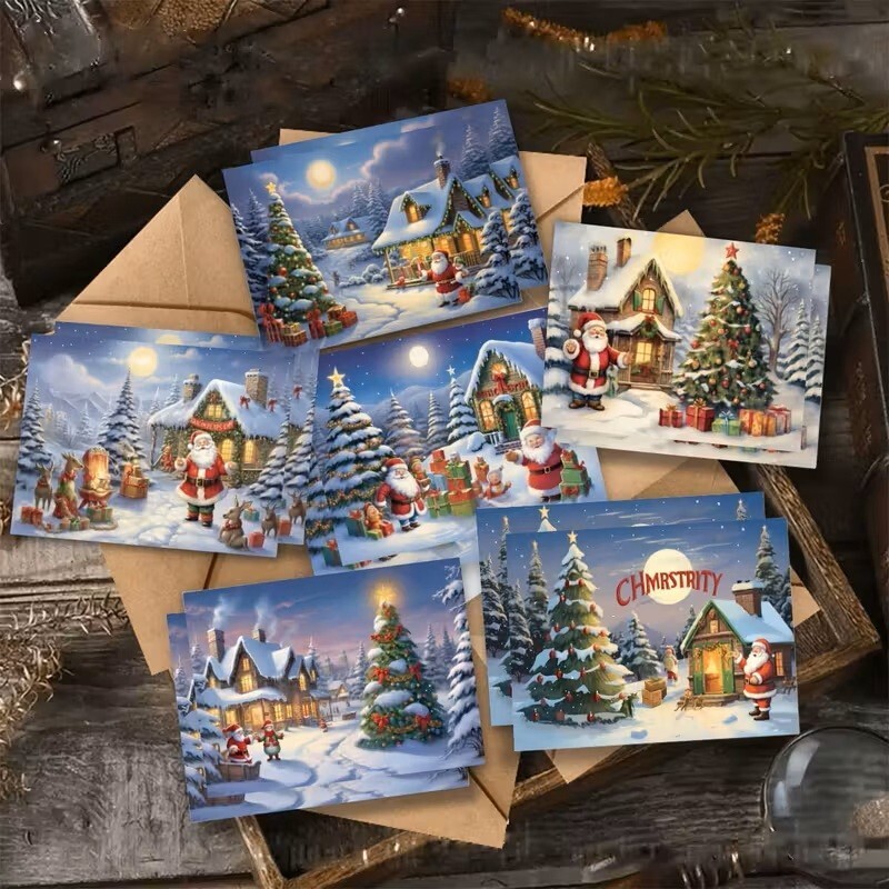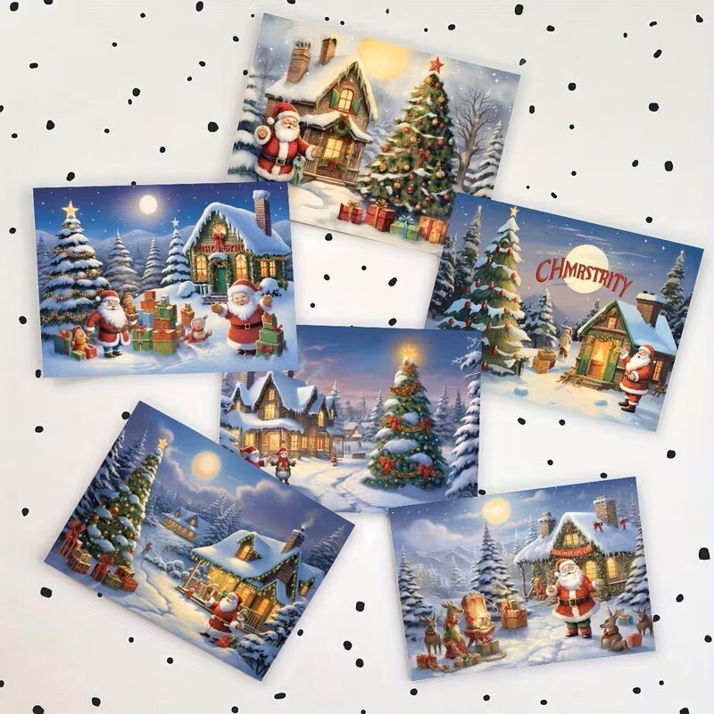 The product is a set of six Christmas greeting cards featuring designs of Santa Claus, Christmas trees, and houses. These cards are perfect for sending holiday greetings during the festive season. Each card in the set is themed around Christmas and is ideal for collecting or sharing with loved ones to spread holiday cheer. The cards are not vintage and come with a variety of designs to suit different tastes and preferences.