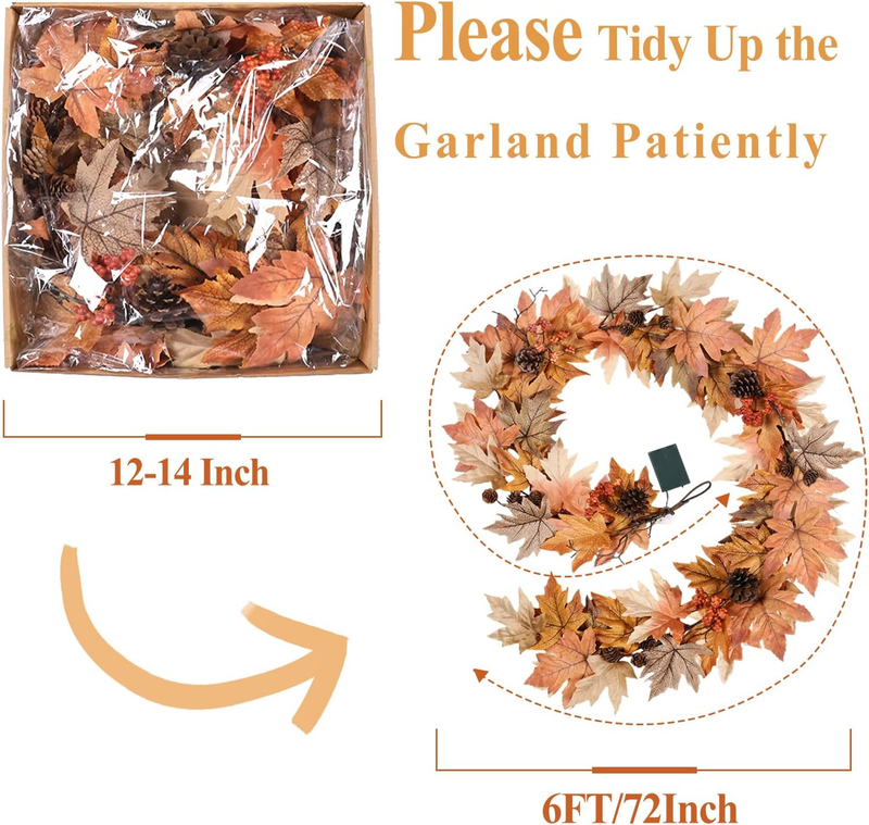 ?6 FT Fall Garland for Mantle?: 6 FT Fall garland with lights is made of high-quality materials, The fall garland outdoor is adorned with pumpkin pinecones and berries. The fake fall leaves have clear veins and bright colors that do not fade easily. The pinecones have three-dimensional and rugged textures and a natural and lifelike shape. The berries are rich in color full and round and Realistic