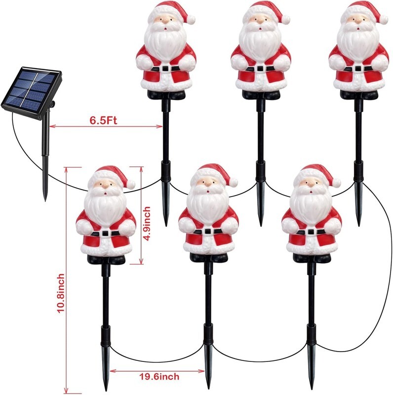 ?New Designed?: 6-IN-1 solar christmas stake lights, Total length: 15ft, lead wire length: 6.56ft, space between LEDs: 20 inch.very bright color eye-catching, very christmas festive display, perfect outdoor christmas decorations.