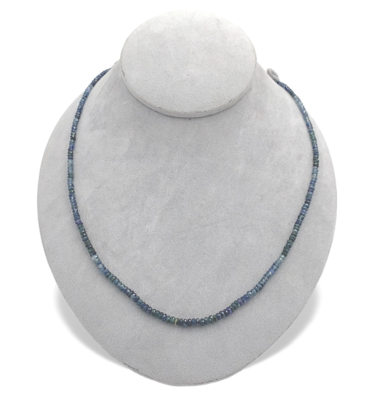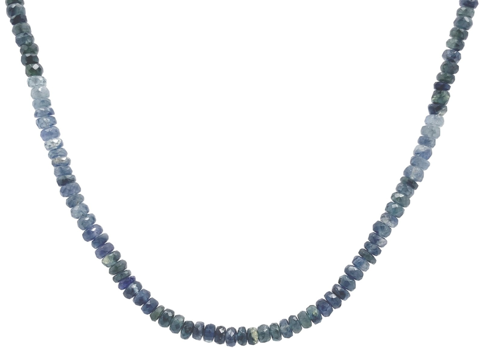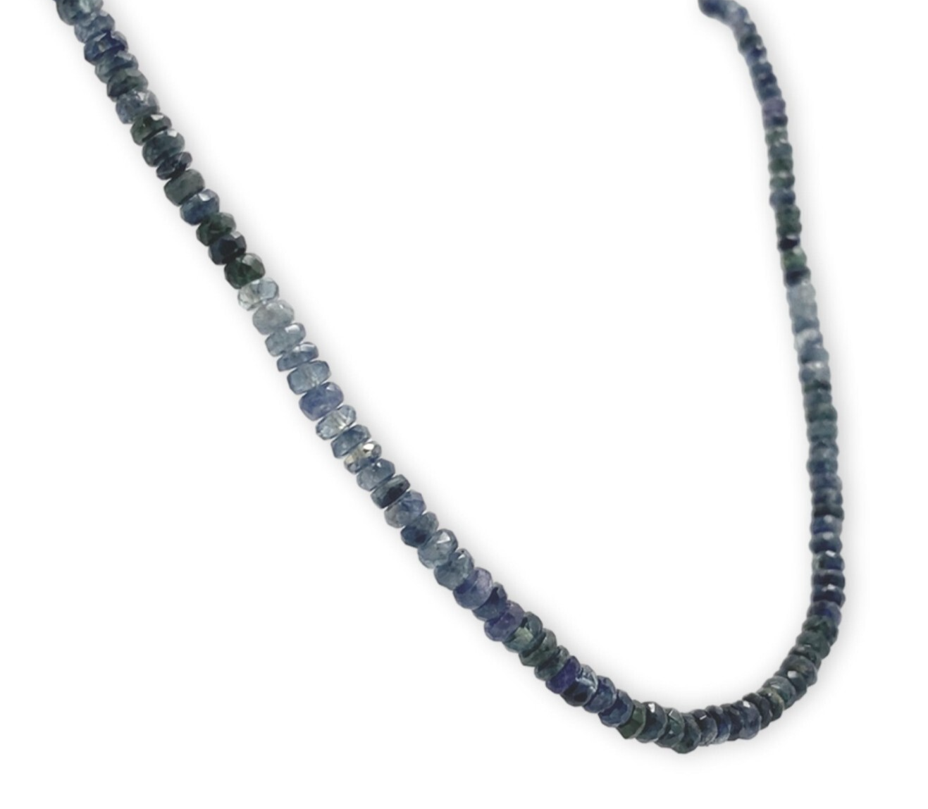 A strand of genuine earth mined blue sapphire beads weighing a total of 60 carats. The faceted rondelle beads are graduated and measure 3mm to 3.5mm. The sapphires have a repeating ombre color pattern of about 2" long going from light grayish-blue to shades of denim blue to very dark blue. The necklace measures 20" long and has a 14k white gold clasp. Some of the beads are chipped. The necklace weighs 7.78 dwt., and is new. Wow!