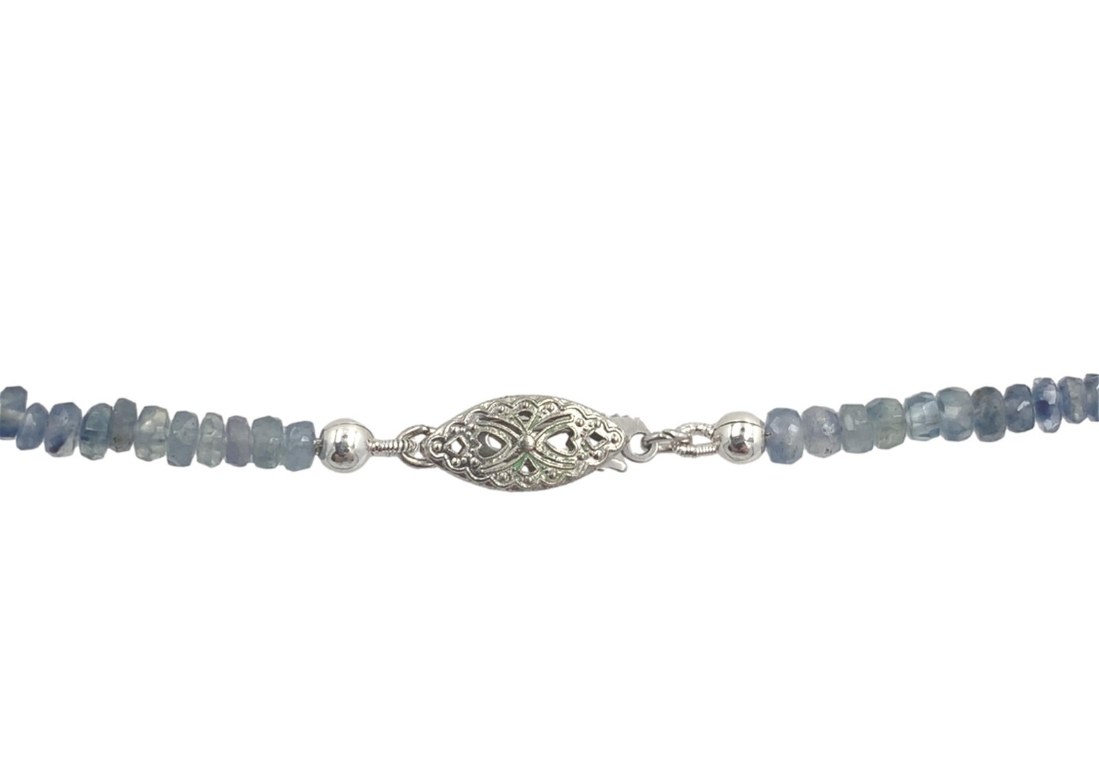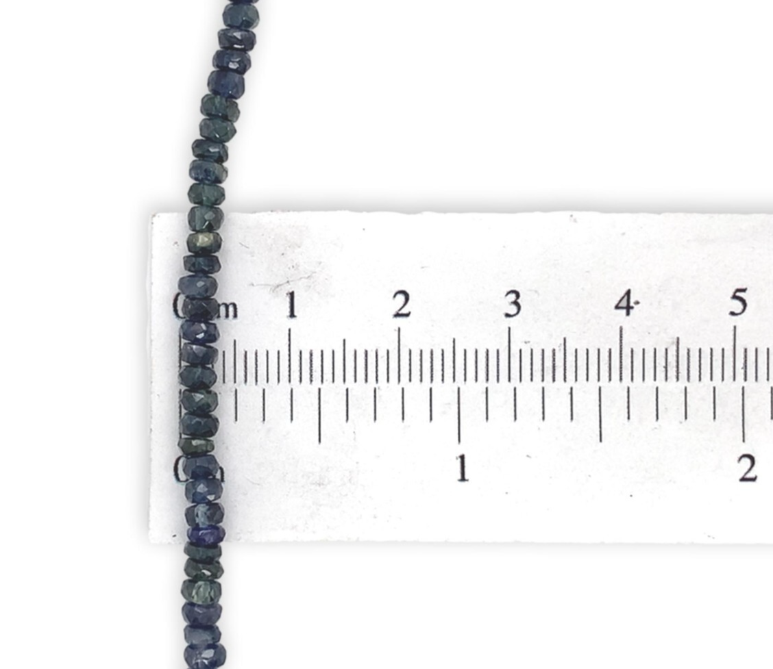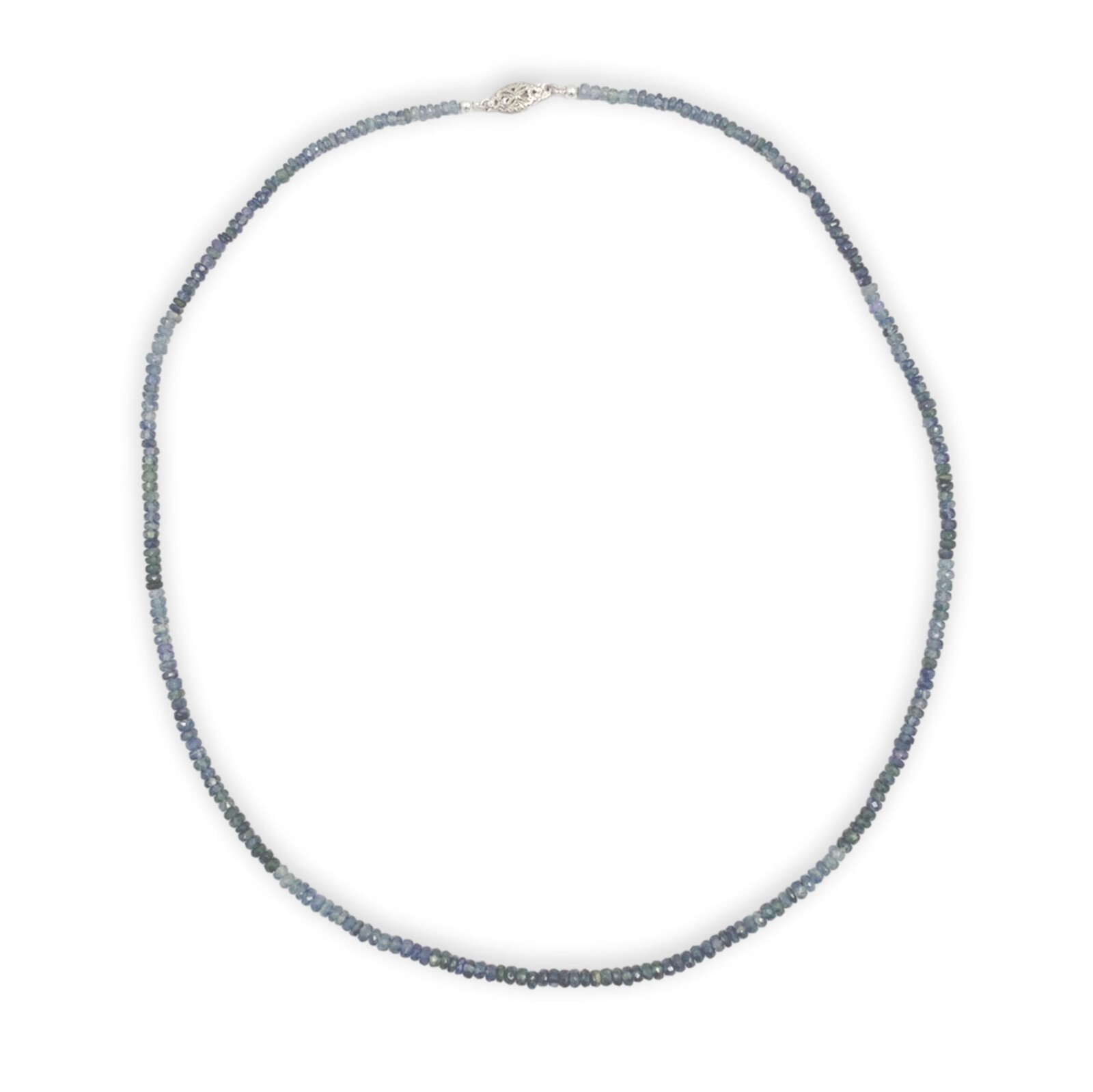 A strand of genuine earth mined blue sapphire beads weighing a total of 60 carats. The faceted rondelle beads are graduated and measure 3mm to 3.5mm. The sapphires have a repeating ombre color pattern of about 2" long going from light grayish-blue to shades of denim blue to very dark blue. The necklace measures 20" long and has a 14k white gold clasp. Some of the beads are chipped. The necklace weighs 7.78 dwt., and is new. Wow!