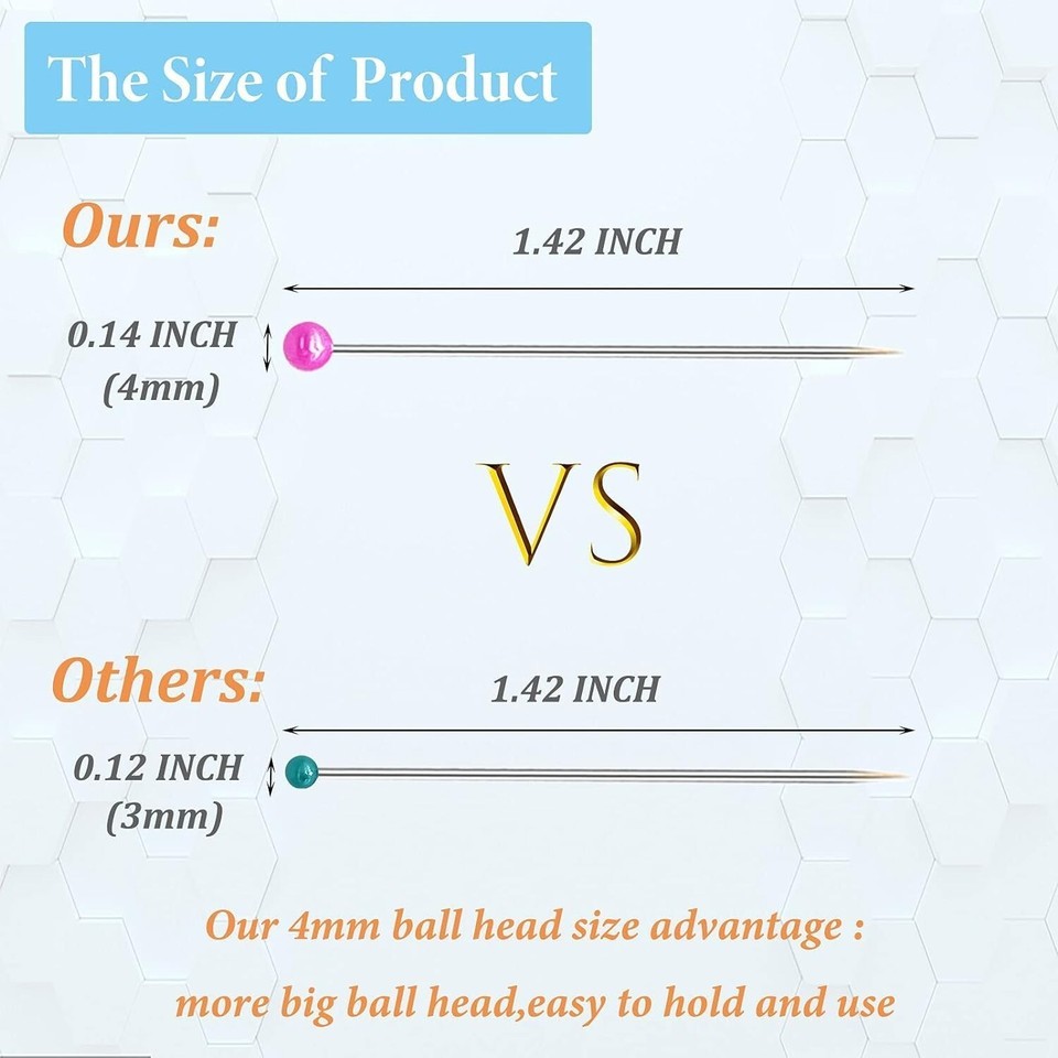 ?Product Size and Package?The diameter of pearlized head is 0.14 inch, the total length of Pin is 1.42 Inch. 600Pcs of assorted color pearl top pins in one clear plastic box, which is easy to use and storage.