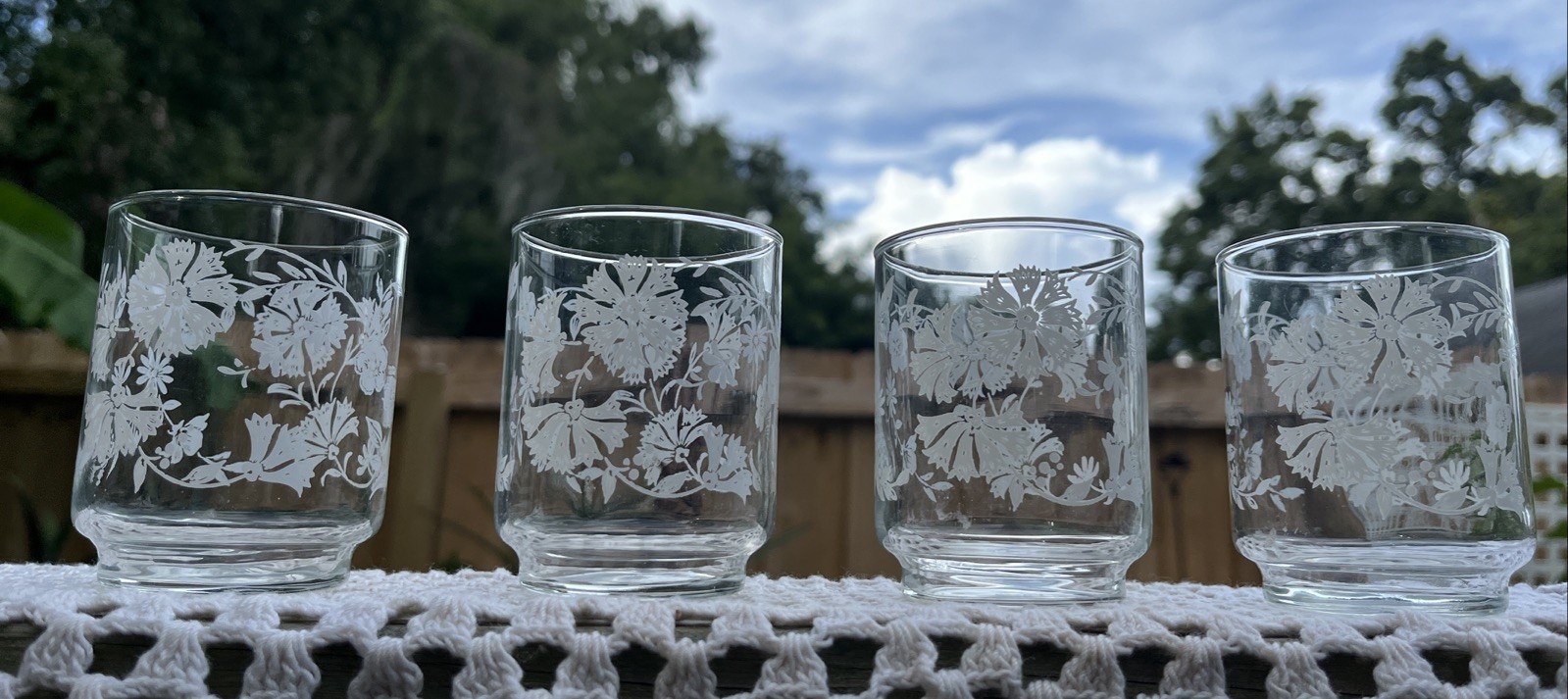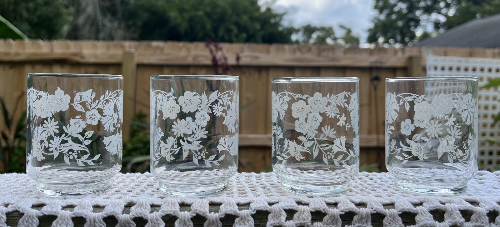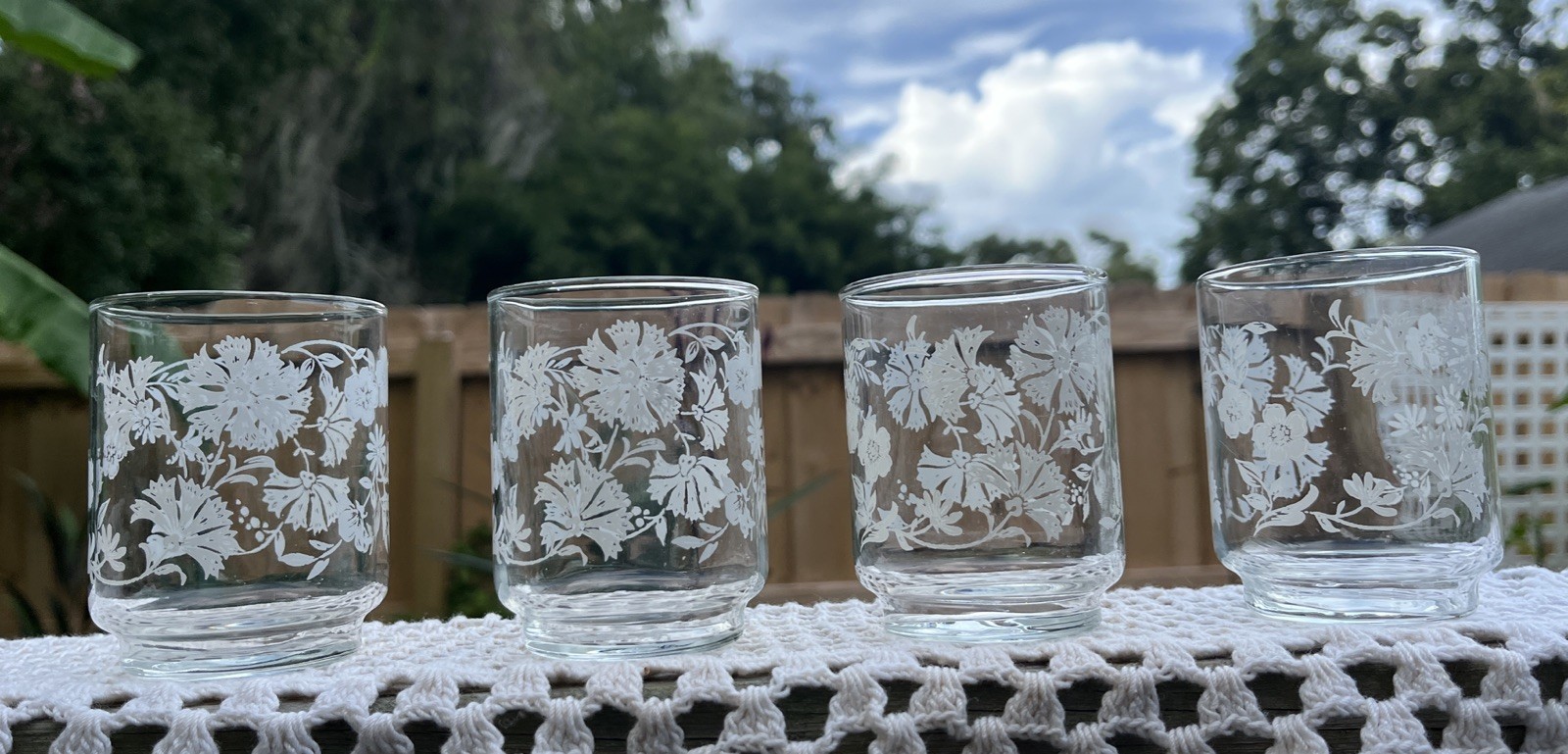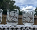 - 60s? Vtg White Floral Libby Clear Glass Juice Tumblers 4 Glasses Colonial Mist