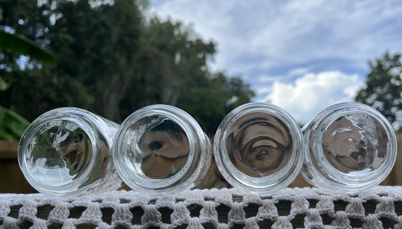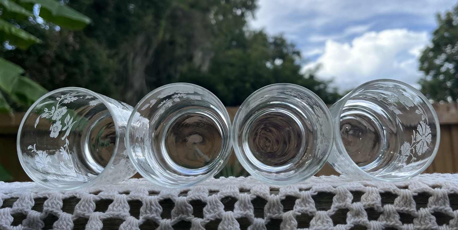This MCM Vintage set consists of four round white floral Libby clear glass Juice glasses. The vintage glasses feature a White Floral Colonial Mist pattern with a glossy finish, typical of pressed glass from the 1960s. Perfect for all occasions, these original 4-piece glasses are a charming addition to any drinkware collection, showcasing a floral theme that adds a touch of elegance to your table setting. Ideal for those who appreciate retro designs and vintage charm. Start a collection or add to existing one ~ each measures approx. 3" Hgt. x 2 1/8" diameter across top mouth openings. All have faint noticeable script "L" on underside bottoms,
