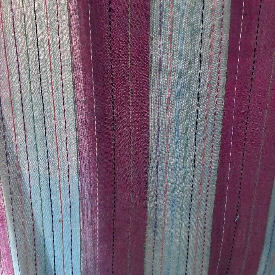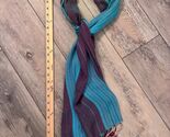 62?x18? unbranded turquoise and purple scarf/wrap. Used but in good condition. Minimal wear on scarf not noticeable when wearing.