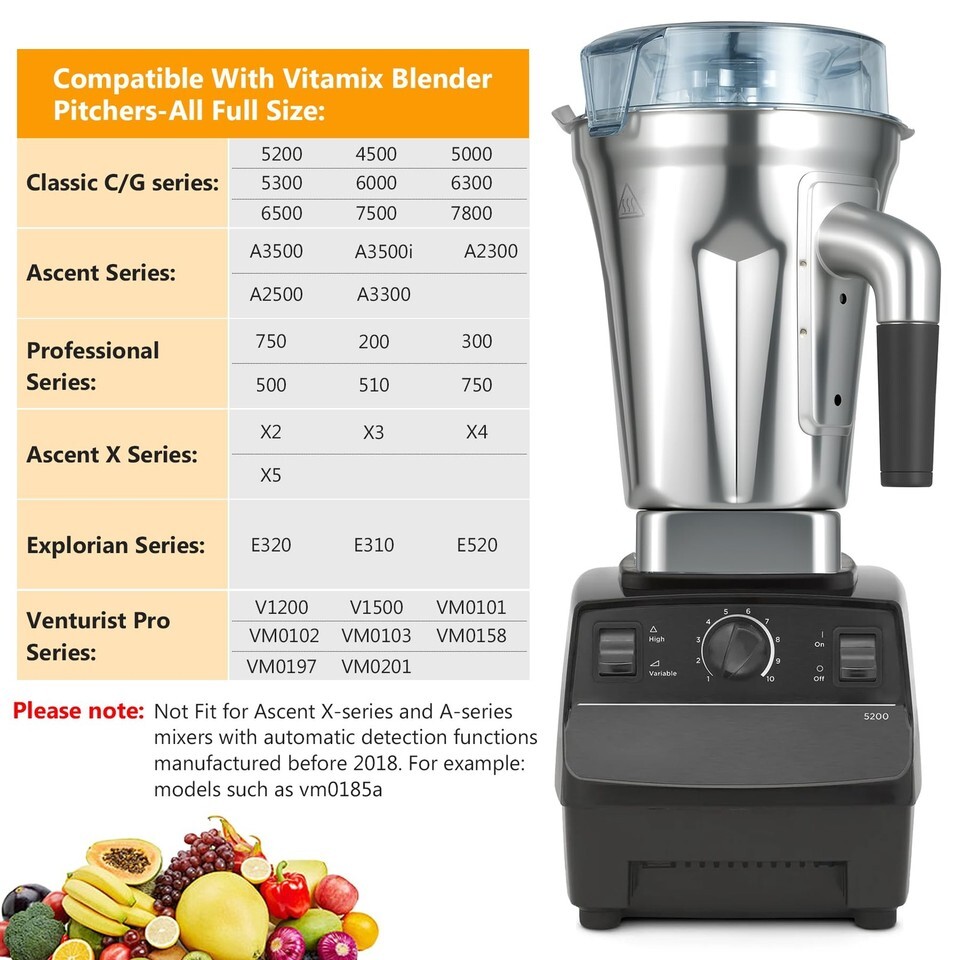 WIDE COMPATIBILITY: This stainless steel pitcher is compatible with all full-size Vitamix blenders, including the Classic C/G Series (5200, 4500, 5000, 5300, 6000, 6300, 6500, 7500, 780), the Ascent Series (A3500, A3500i, A2300, A2500, A3300), the Professional Series (750, 200, 300, 500, 510), the Explorian Series (E310, E320, E520), and the Venturist Pro Series (V1200, V1500, VM0101, VM0102, VM0103, VM0158, VM0197, VM0201).