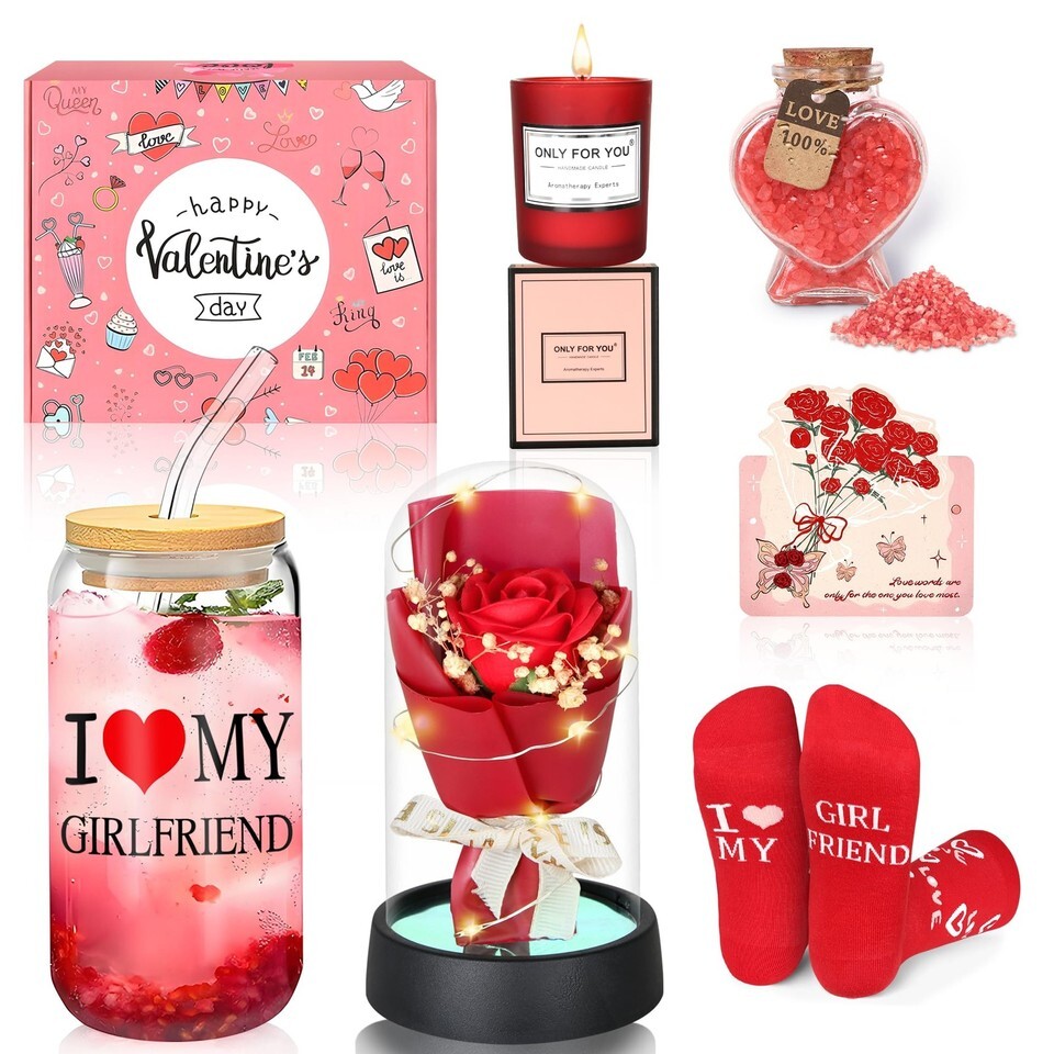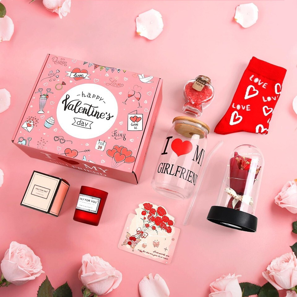 6PCS Valentines Gift Box Women 12oz Wine Tumbler Rose Socks Candle