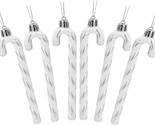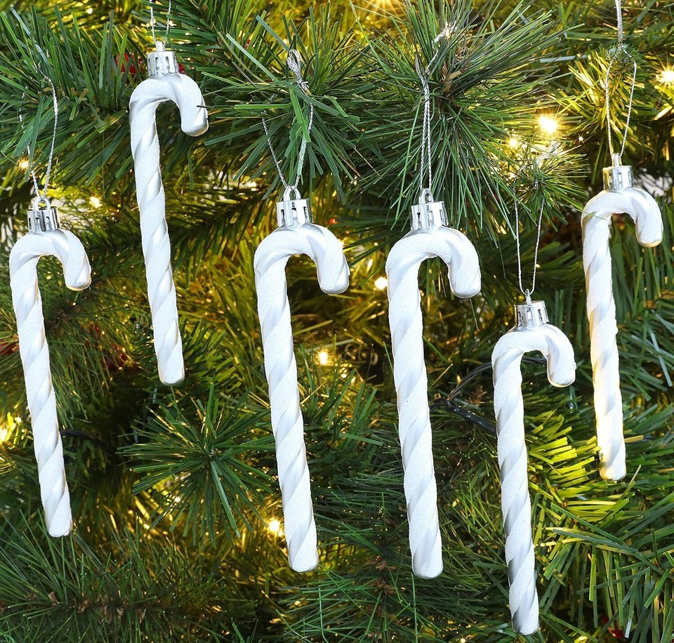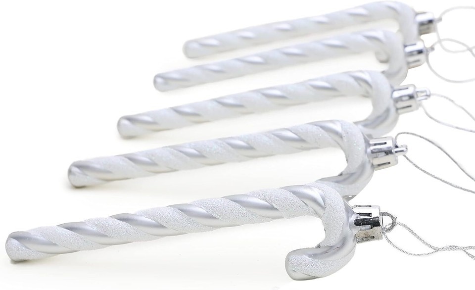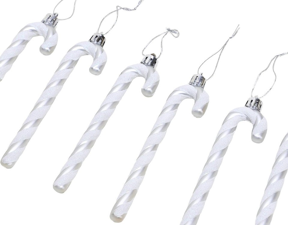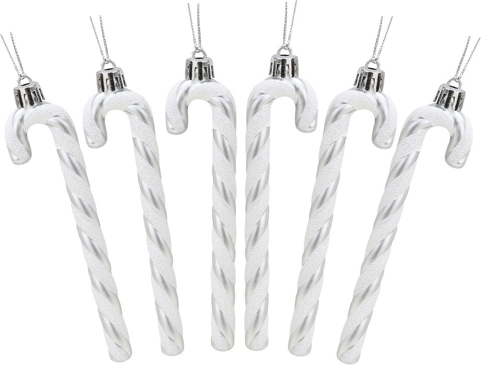 Add festive charm to your tree with this 6-pack of glittery candy cane decorations from Christmas Concepts. Each candy cane features a classic striped design in silver and white, complete with a gold hanging loop for easy placement on your tree, wreath, garland, or around your home.