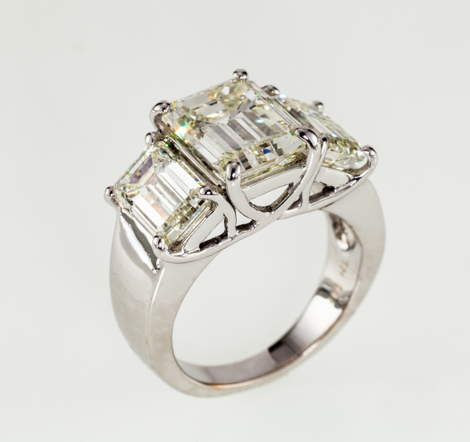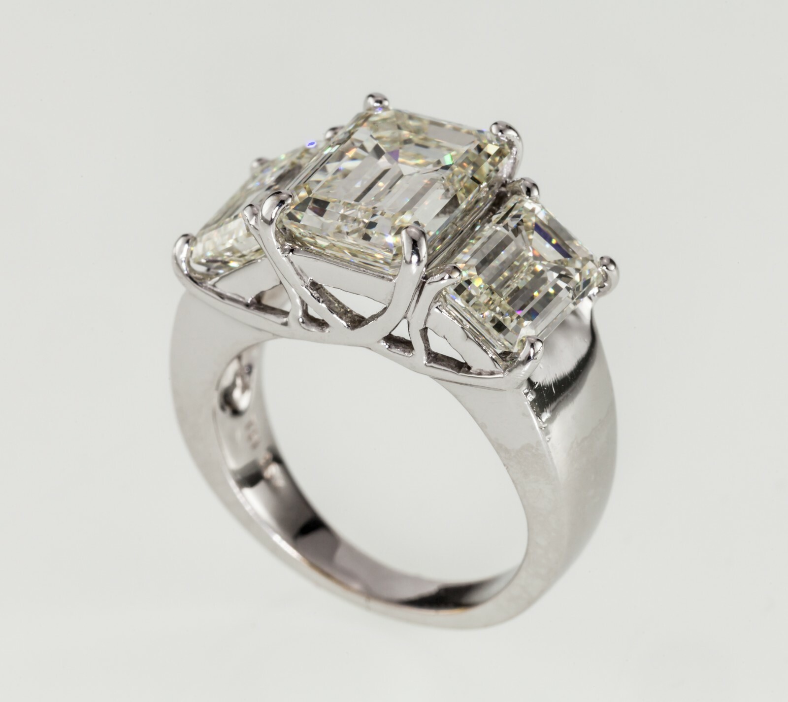 - 7.66 carat Emerald-Cut 3-Stone 18k White Gold Diamond Engagement Ring