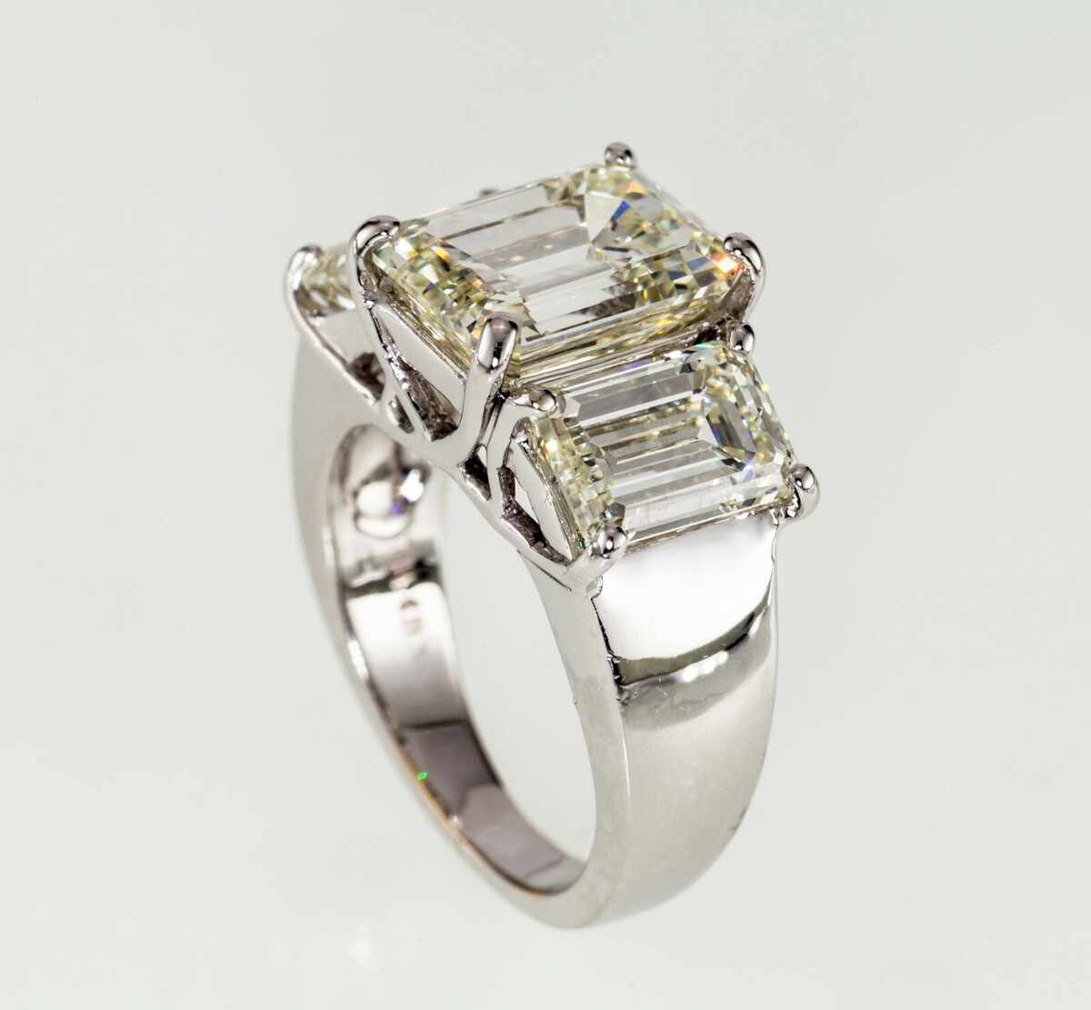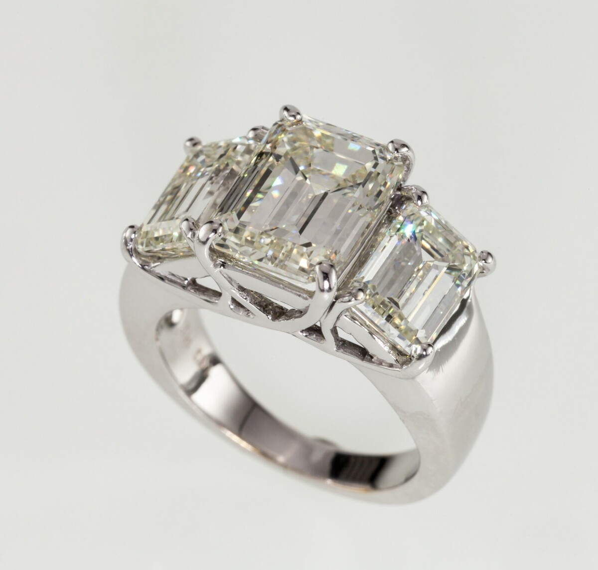 - 7.66 carat Emerald-Cut 3-Stone 18k White Gold Diamond Engagement Ring