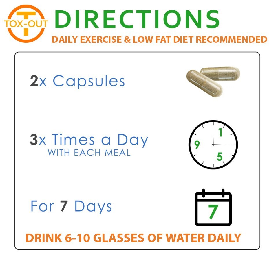 Take the capsules as directed for seven days, drink plenty of water, and follow a healthy diet for the best results. Tox-Out supports your body's natural cleansing process, leaving you feeling light, clear-headed, and revitalized.