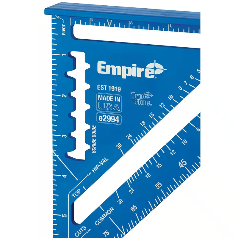 The Empire True Blue Laser Etched 7 in. Rafter Square (e2994) features permanent laser markings for superior readability in any light condition. SCRIBE-GUIDE precision scribe notches allow users to easily mark parallel lines on lumber. Hi-visibility laser etched markings won't fade after heavy use on multiple job sites. The rafter layout square is made from a durable anodized aluminum that is more durable than diecast and will not rust or corrode after exposure to the harsh job site elements. The Empire rafter square features conversion tables for common applications. The square features an increased heel width that is up to 15% wider than leading competitors giving users increased stability on all job site material.