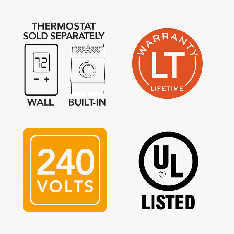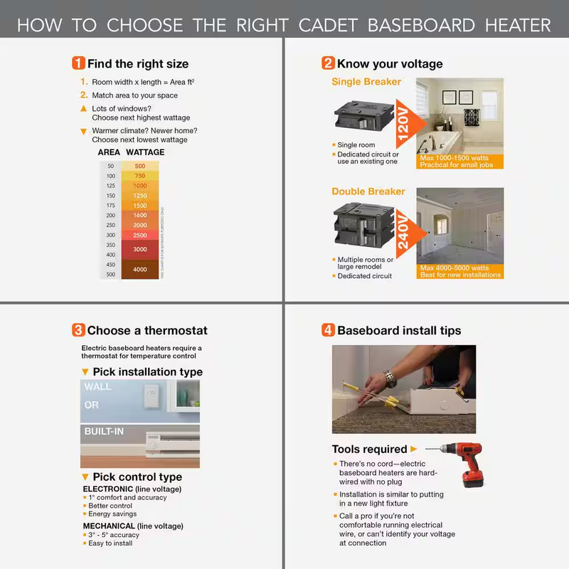 Cadet electric baseboard heaters are a simple and economical way to add quiet, convection heat wherever it's needed in your home. This white 72-inch heater is an industry-standard size making it ideal for replacement or new construction, and is designed for easy installation with pre-punched mounting marks and wiring at both ends. A thermostat is required for operation (sold separately). Be sure to choose the correct heater size for your room. On the chart below, find the area size you want to heat and then select the corresponding wattage. Proudly made in the USA.