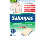Pain Relieving Patch, Large, 6 Count Other Information: Avoid storing product in direct sunlight. Protect product from excessive moisture. Misc: 2.83 inches x 1.81 inches (7.2 cm x 4.6 cm). New improved. Stiff neck. Sore shoulder. Backache. Joint pain. More medicine (Compared to Original Salonpas). Better flexibility (Compared to Original Salonpas). 20% larger (Compared to Original Salonpas). Apply for 8 hours. Questions or comments? Toll free 1-800-826-8861 www.salonpas.us. This product is not made with natural rubber latex. For Foot: 1 patch on sole. 1 patch on top. For Calf: 1 patch on left side. 1 patch on right side. Made in Japan. Uses: For temporary relief of minor aches pains of muscles joints associated with: arthritis; simple backache; strains; bruises; sprains. Adults and Children 12 Years of Age and Over: Clean and dry affected area. Remove patch from film. Apply to affected area not more than 3 to 4 times daily. Remove patch from the skin after at most 8-hour application. Children Under 12 Years of Age: Consult a doctor. Warnings: For external use only. Allergy alert: If prone to allergic reaction from aspirin or salicylates, consult a doctor before use. Do not use: on wounds or damaged skin; with a heating pad; if you are allergic to any ingredients of this product. When using this product: use only as directed; avoid contact with the eyes, mucous membranes or rashes; do not bandage tightly. Stop use and ask a doctor if: rash, itching or excessive skin irritation develops; conditions worsen; symptoms persist for more than 7 days; symptoms clear up and occur again within a few days. Pregnancy/breast-feeding warning: If pregnant or breast-feeding, ask a health professional before use. Keep out of reach of children. If swallowed, get medical help or contact a Poison Control Center right away. 60 patches Florham Park, NJ 07932 800-826-8862