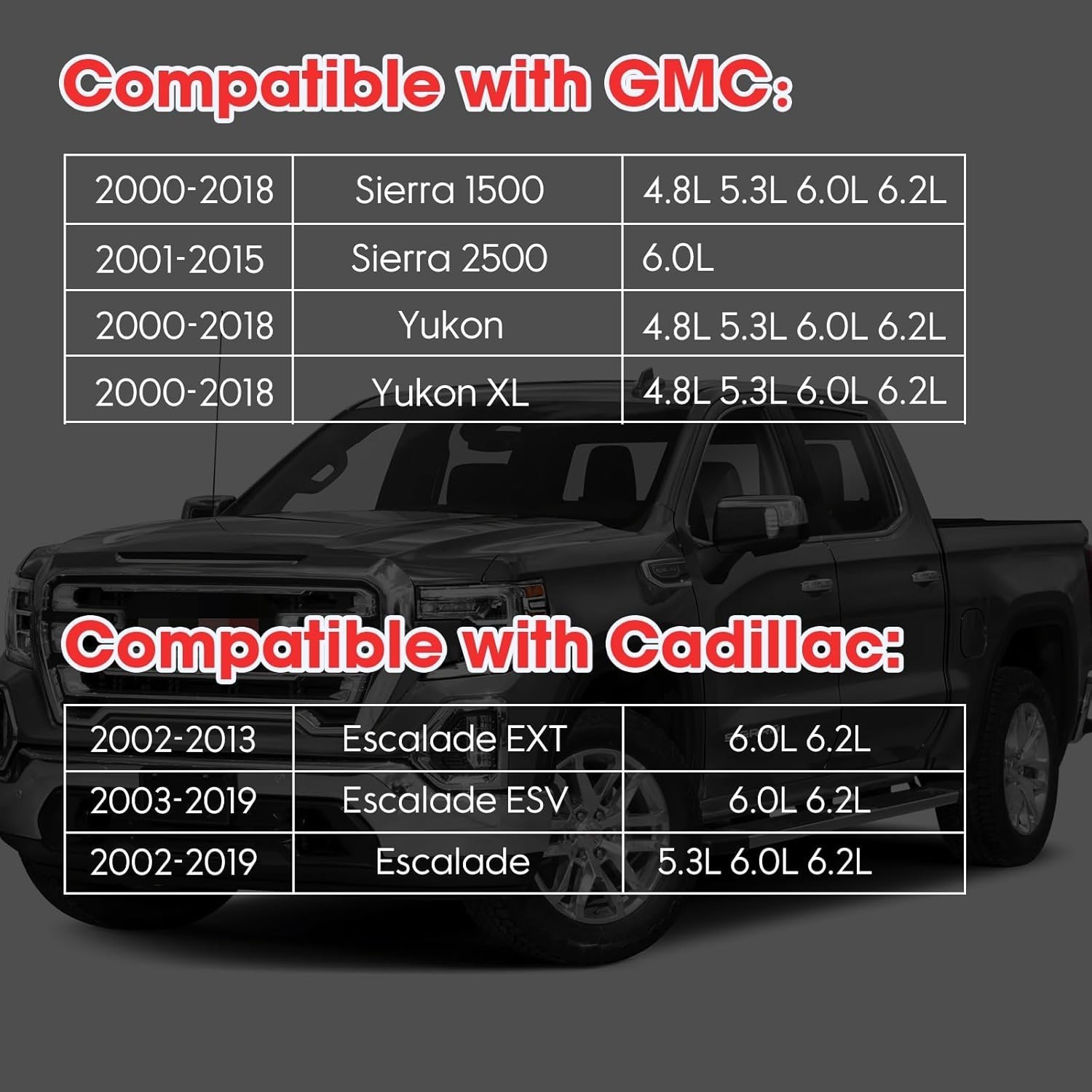Compatible with 2000-2018 Sierra, 2000-2018 Yukon , 2002-2019 Escalade, with 4.8 5.3 6.0 6.2 v8 engine.Please confirm your car model's compatibility before purchase.