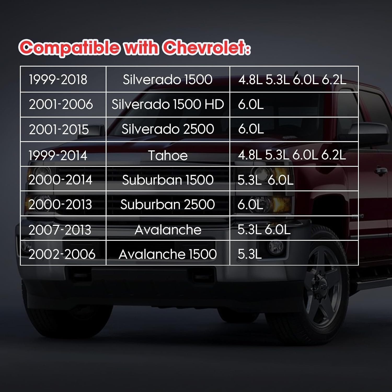 Compatible with 1999-2018 Silverado 1500, 2000 - 2014 Suburban, 2000 - 2014 Tahoe, 2002 - 2013 Avalanche, with 4.8 5.3 6.0 6.2 v8 engine