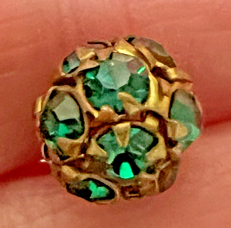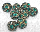 - 8 Vintage Art Rhinestone Prong Set Beads Dark Green in Gold Metal 3/8 inch